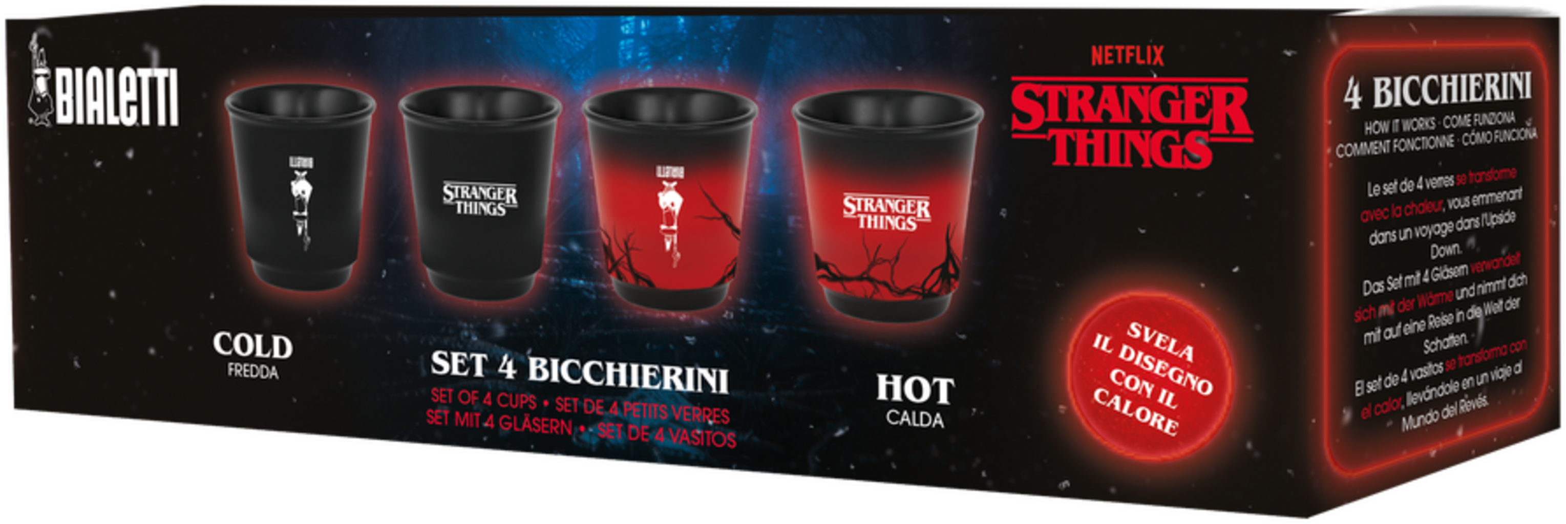 S kolekcijo "Stranger Things" postane priprava in pitje kave in drugih toplih napitkov posebna pustolovščina. Poleg fantastičnih motivov imajo vsi kosi termosenzibilne učinke, ki spreminjajo svoj videz, ko so napolnjeni s toplo tekočino, ali pa se v temi rdeče svetijo. Absolutni nepogrešljivi kosi za vse oboževalce kultne serije "Stranger Things" in seveda čudovito darilo.