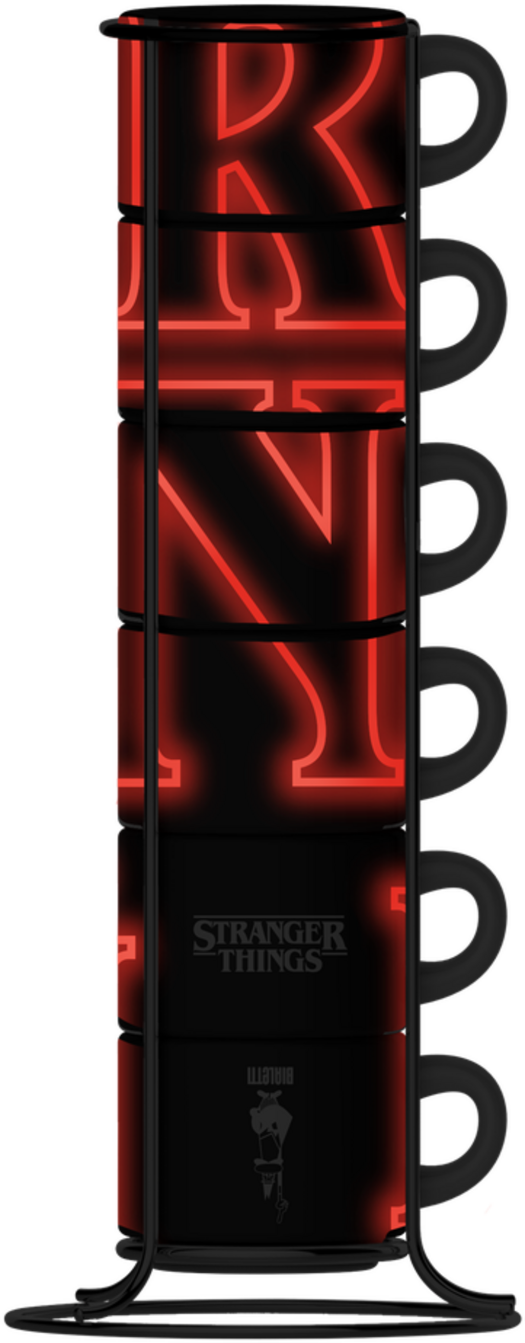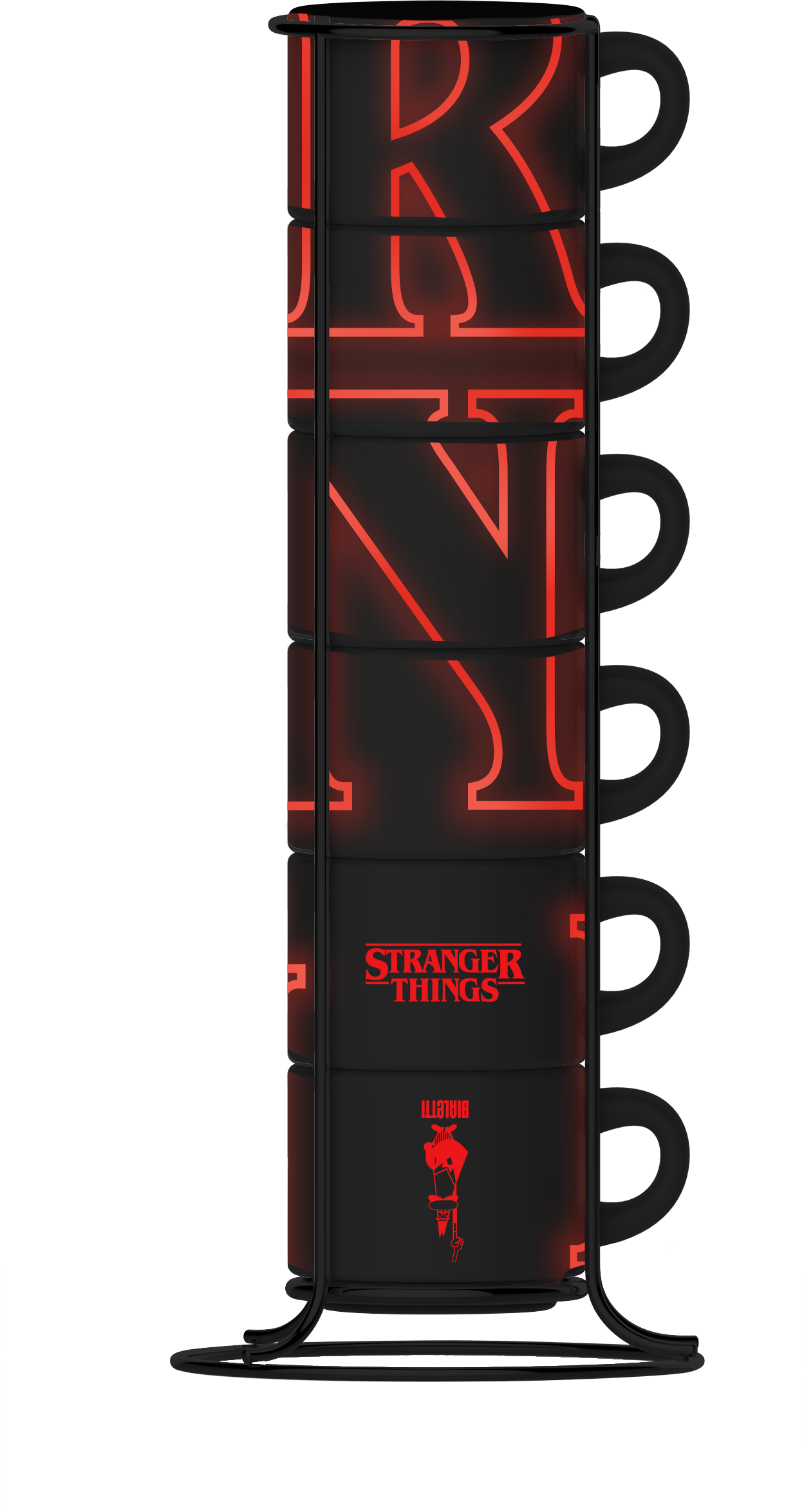 Edinstven dekorativni dodatek za vsako kuhinjo. Te skodelice za espresso, oblikovane v videzu kultne serije "Stranger Things", niso le priročno zložljive v kovinsko stojalo, ampak se tudi svetijo v temi.