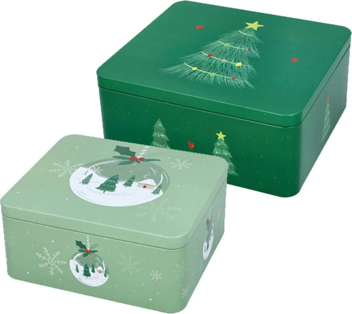 Visokokakovostna, proti rji odporna pločevina zanesljivo ščiti vaše pecivo pred zrakom in vlago, čarobni motiv snežne krogle pa prebuja pričakovanje božiča. Zaradi praktične velikosti in kvadratne oblike sta škatli še posebej praktični – za zlaganje, obdarovanje ali okraševanje.