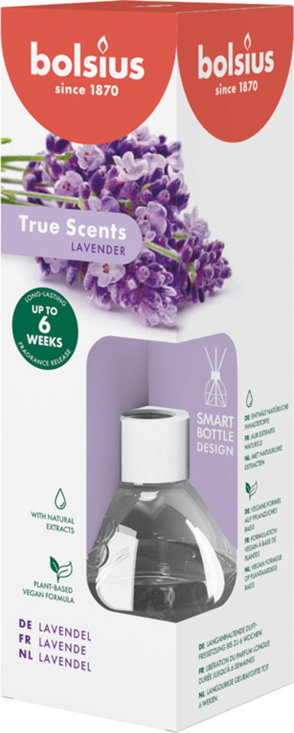 True Scents dišava za prostore znamke Bolsius v vaših bivalnih prostorih sprošča nežen vonj do 6 tednov. Naj bo to v dnevni sobi, kopalnici ali predsobi – ta dišava ustvarja dolgotrajno in prijetno vzdušje. Njena botanična formula je obogatena z naravnimi izvlečki.