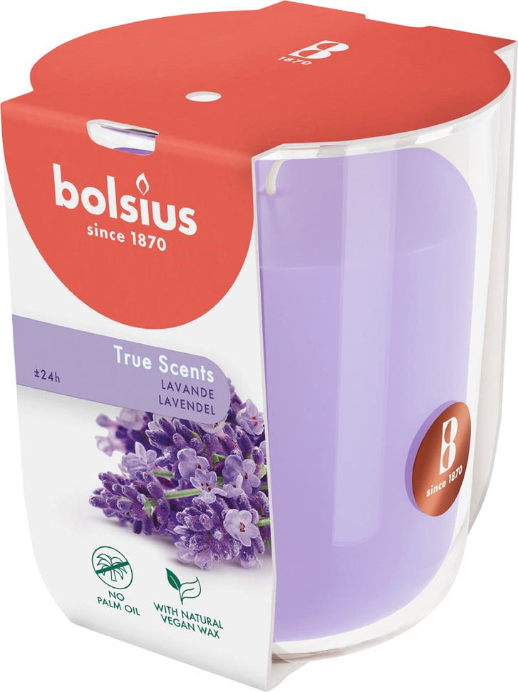 True Scents dišeča sveča v kozarcu znamke Bolsius zagotavlja optimalno razpršitev vonja v vašem bivalnem prostoru do 25 ur. Zahvaljujoč tehnologiji Freshplex™ celo pomaga nevtralizirati tobačni dim. Sveča je delno izdelana iz rastlinskega voska in ne vsebuje palmovega olja.