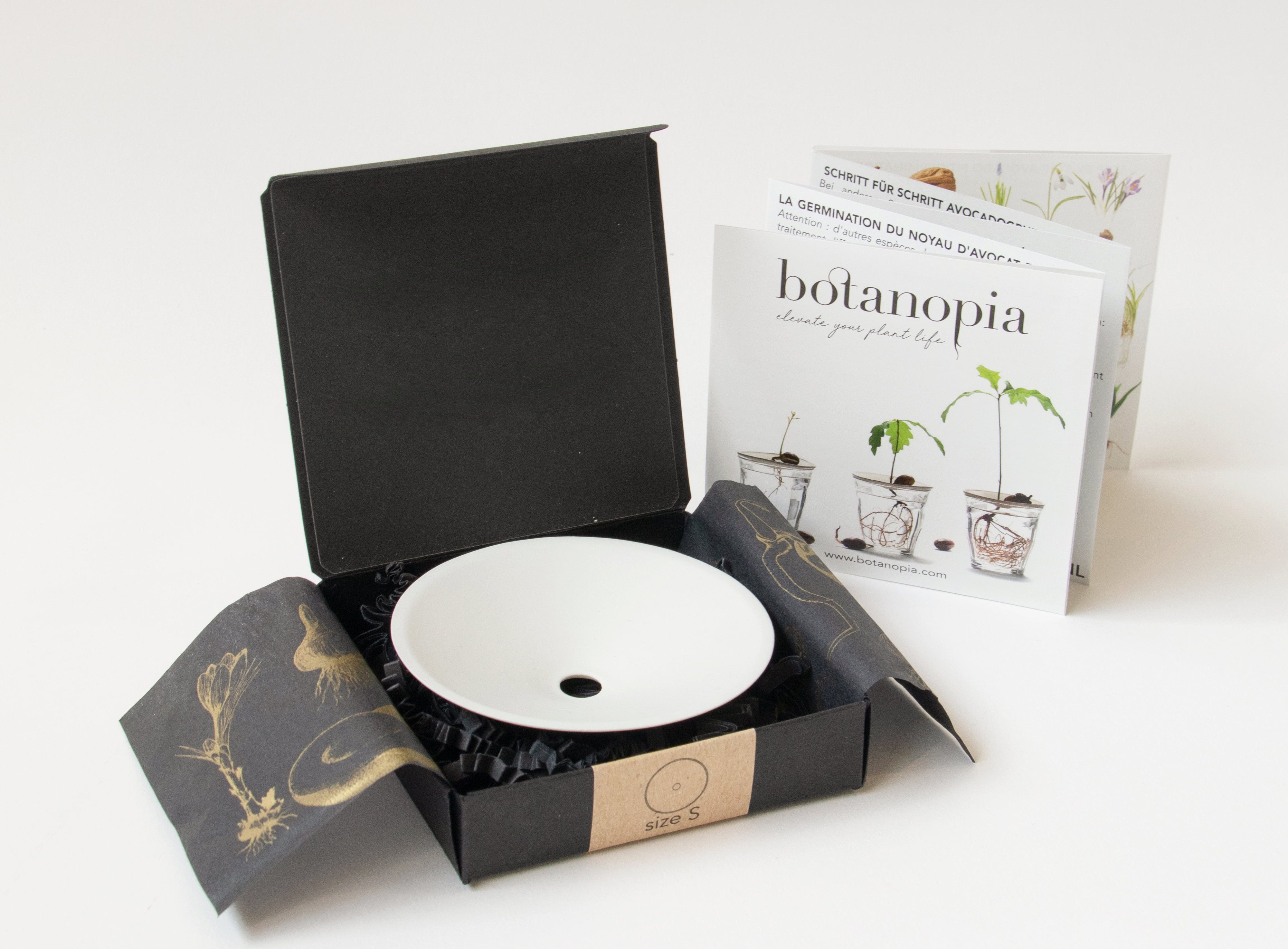 Ta kalilna plošča iz finega porcelana je še posebej eleganten pripomoček za gojenje in ni le praktična, ampak tudi edinstveno okrasna. Združuje obliko in funkcijo na popolnoma novem nivoju in izpolnjuje tudi najvišje zahteve glede estetike in kakovosti. V povezavi s kozarcem vam omogoča tudi opazovanje kaljenja semen. Ta kalilna plošča je tudi izjemno presenečenje kot darilo za ljubitelje rastlin in prihaja k vam že zapakirana v elegantni črno-zlati škatli.