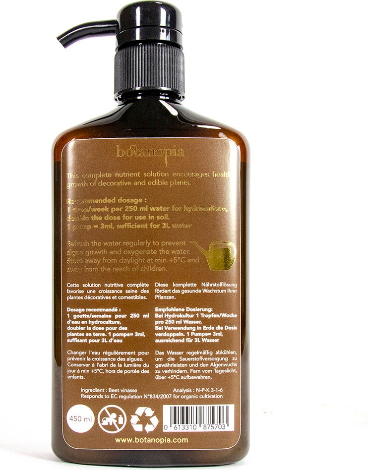 To popolnoma organsko gnojilo je sestavljeno iz čistega izvlečka pese in je primerno za vse običajne lončnice in hidroponske rastline. Podpira njihovo zdravo rast na popolnoma organski in veganski način ter tako zagotavlja močne rastline.