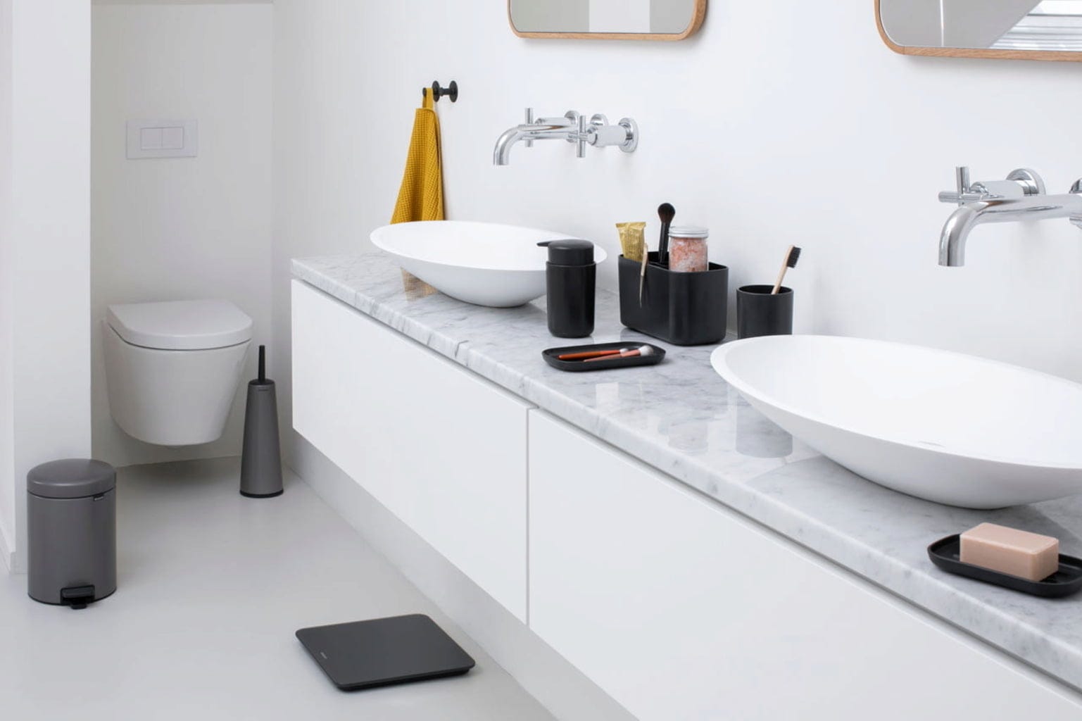 Zahvaljujoč reducirani obliki in barvi se sodoben trio ujema s številnimi slogi in ga je enostavno kombinirati z drugimi kopalniškimi dodatki.