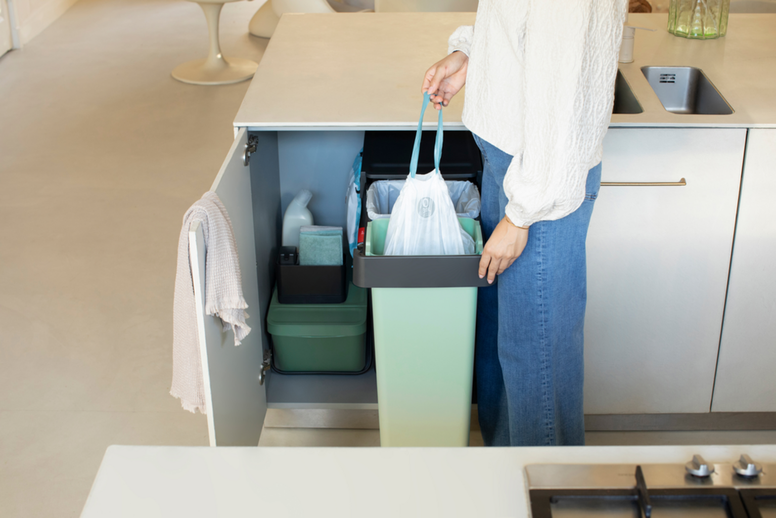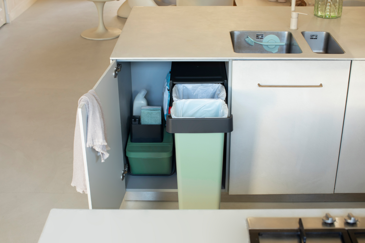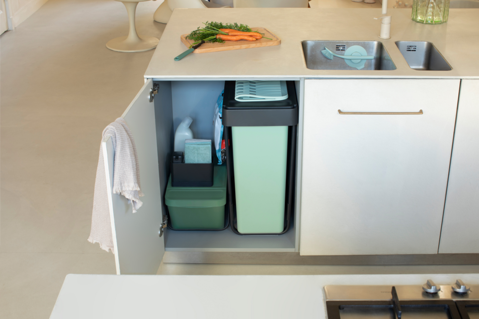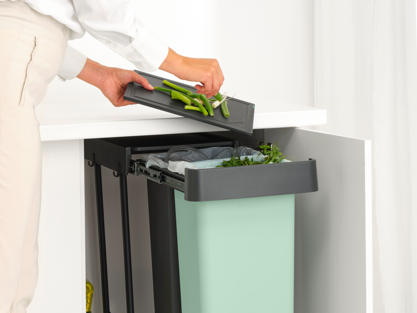 Pametni vgradni koši za smeti iz kolekcije "Sort & Go" znamke Brabantia so zaradi svoje prostorsko varčne zasnove lahko popolnoma skriti.