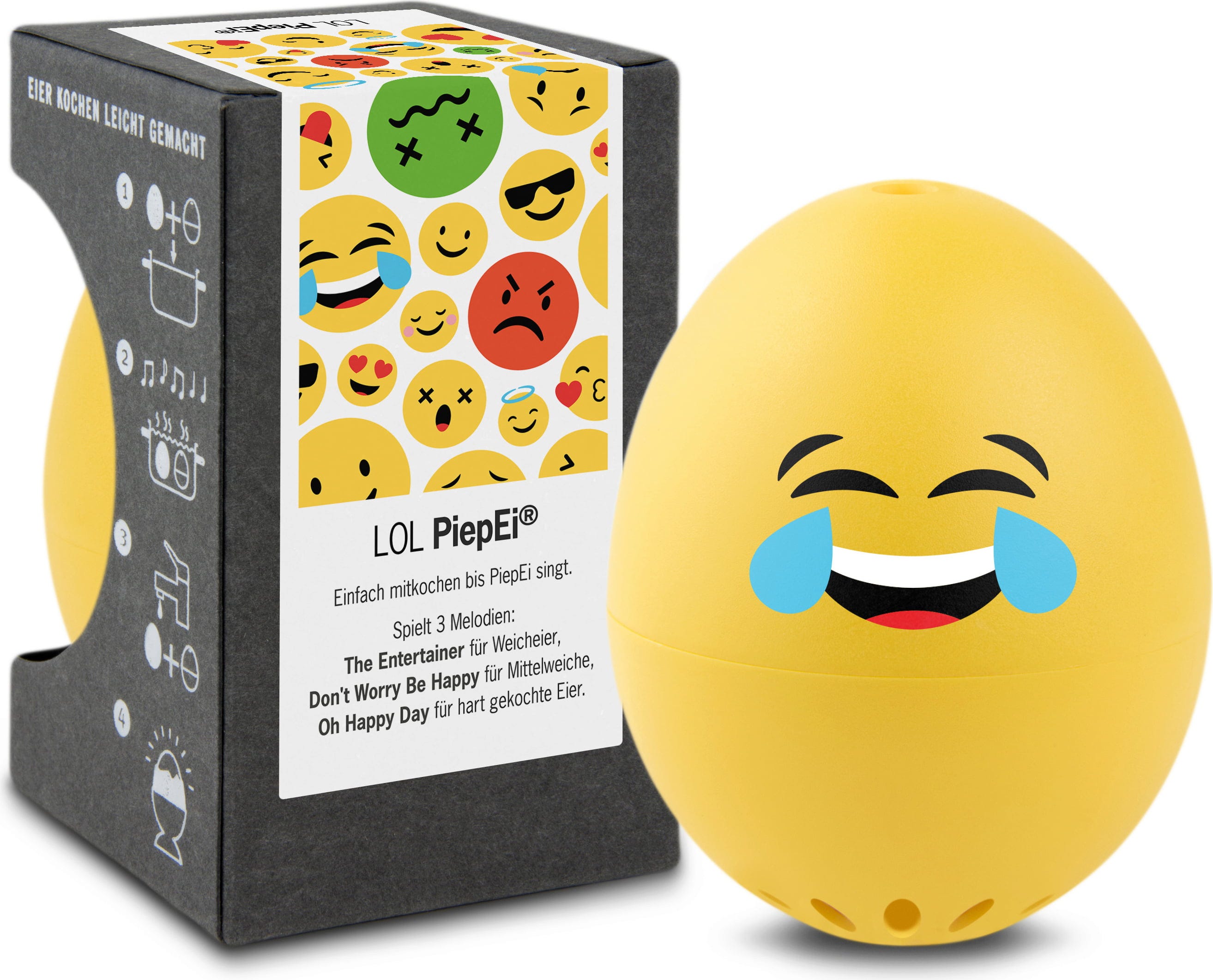 Preprosto postavite merilnik za kuhanje jajca LOL PiepEi v vodo skupaj z jajci in počakajte, da se začne predvajati melodija želene stopnje kuhanih jajc. Naprava deluje ne glede na začetno temperaturo vode, velikost jajc ali nadmorsko višino kuhanja.