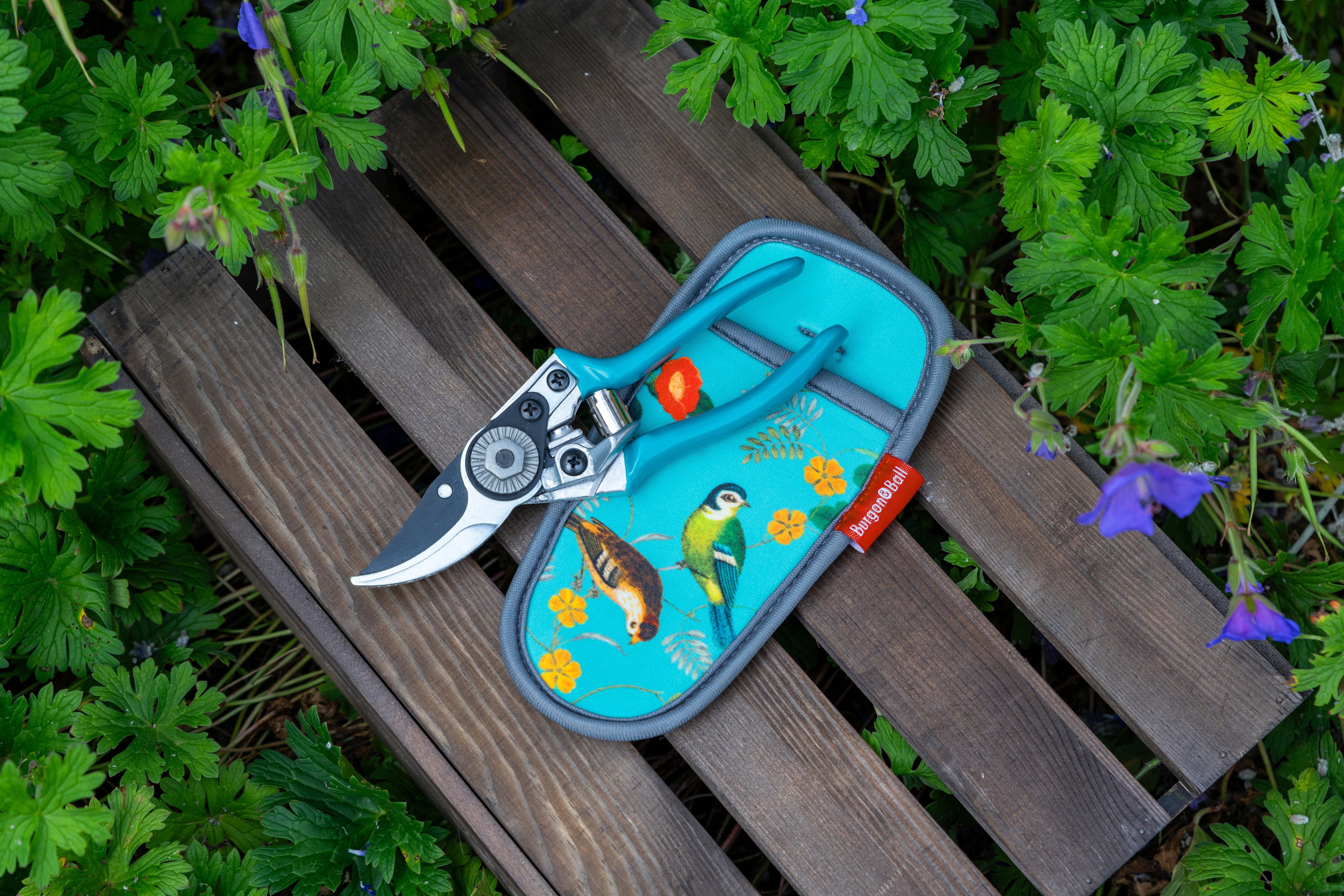 Da boste imeli orodje vedno pri roki, je kompletu priložen ujemajoč neoprenski etui, ki ga krasijo očarljivi motivi "Flora & Fauna" iz zgodovinskih arhivov RHS. Etui lahko priročno pritrdite na pas in ščiti škarje, medtem ko se prosto gibljete po svojem zelenem kraljestvu.