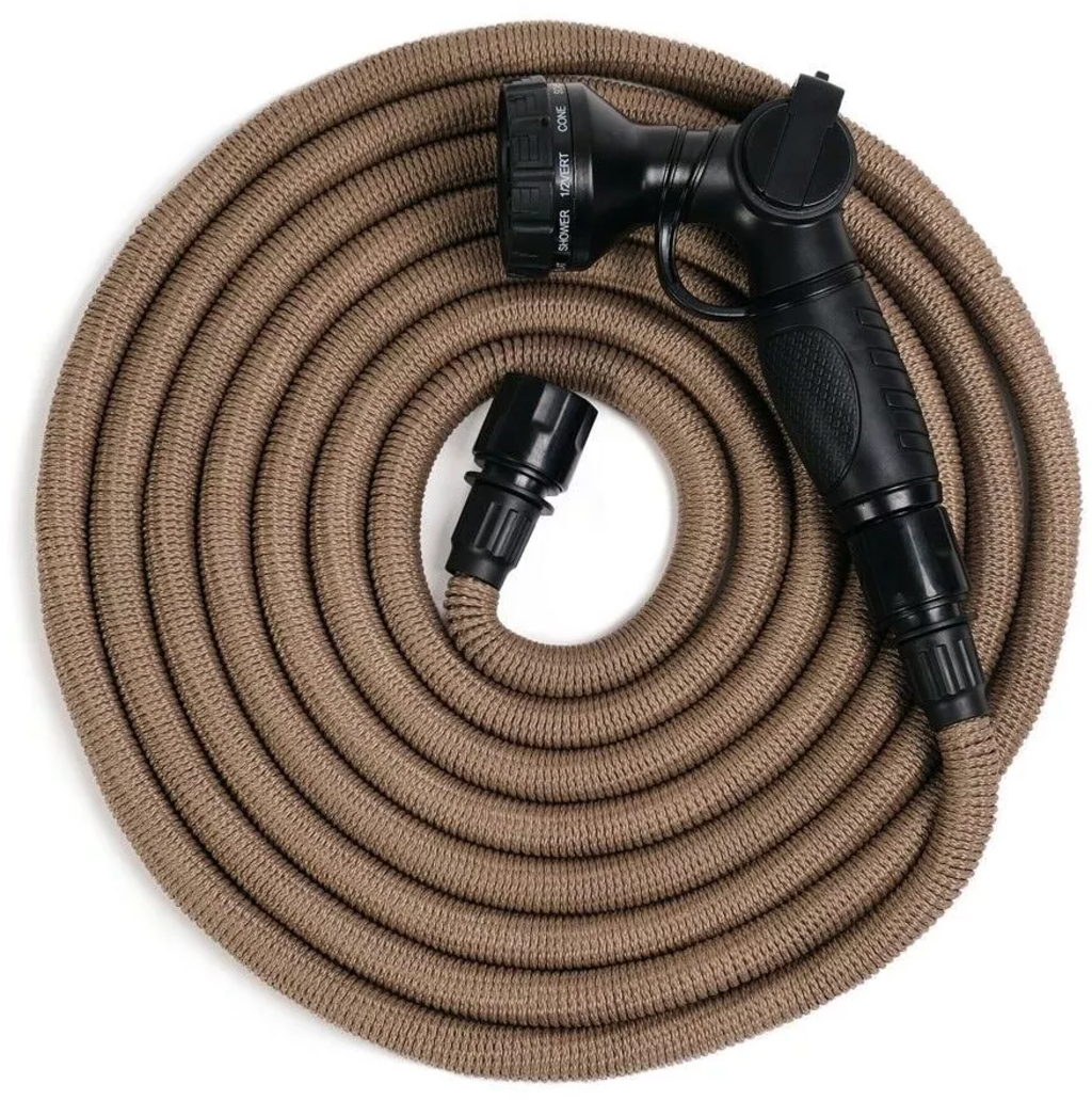 Vrtna cev Deluxe: Ta 25 m dolga cev, ki je na zunanji strani izdelana iz trpežne tkanine, v notranjosti pa iz naravnega lateksa, se razvije s pomočjo vode in se harmonično zlije z vašim vrtom.