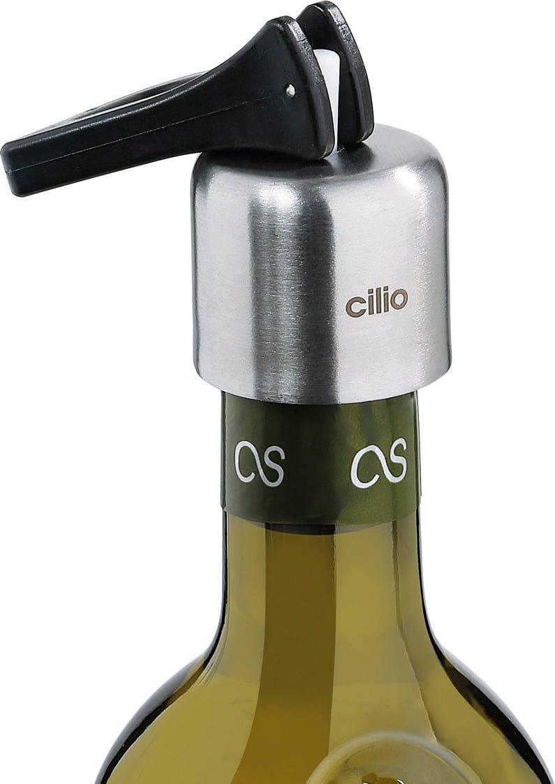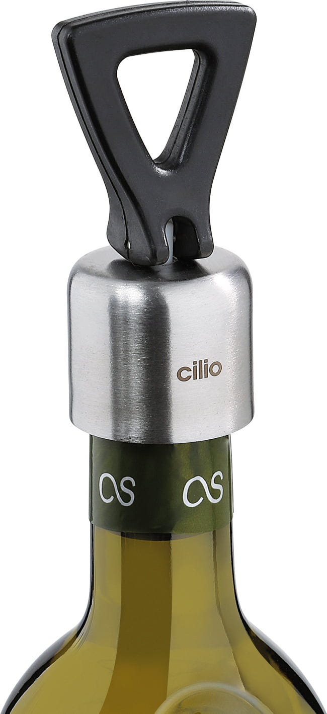 Z elegantnim zamaškom za vino LEVA znamke cilio podaljšate uživanje v vrhunskih vinih. Zaradi elegantne kombinacije svetlečega nerjavečega jekla in črne plastike je ta pripomoček vizualna pridobitev vsakega domačega bara. Zanesljivo preprečuje oksidacijo vina, tako da lahko tudi po več dneh še vedno doživljate fine nianse svojega najljubšega vina v neokrnjeni obliki.