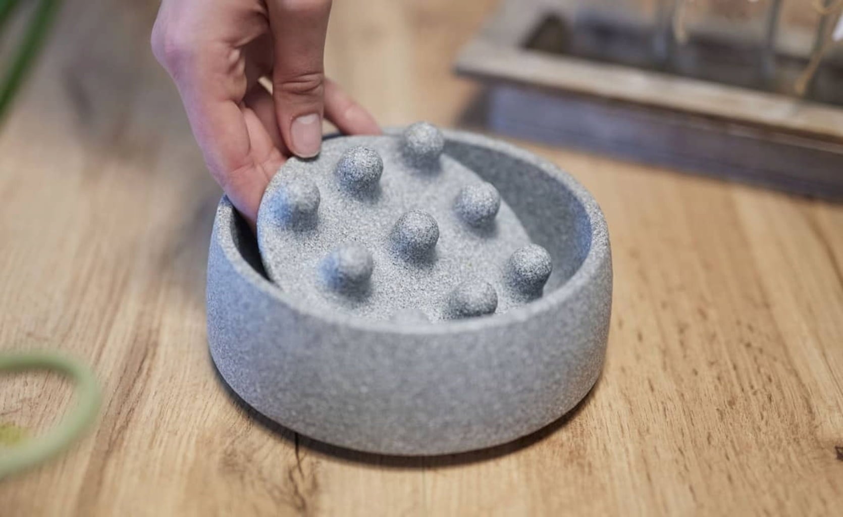 Popoln dodatek za posodo za pse Granicium®. Vložek, narejen iz keramične ploščice z izboklinami, je v skledo nameščen brez pritrditve, kar upočasni hranjenje in prepreči goltanje. Na keramični ploščici si lahko pes tudi očisti jezik.