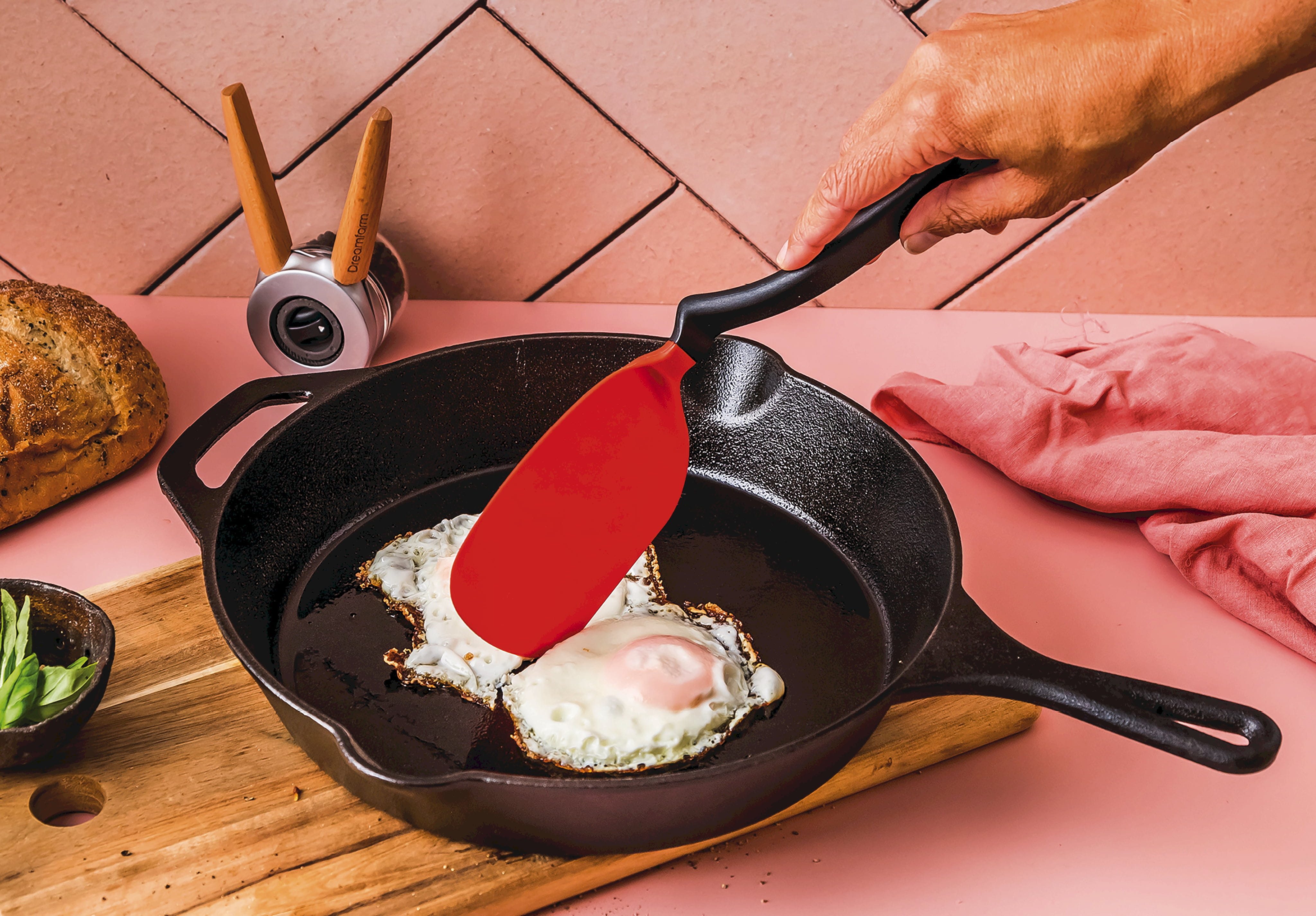Lopatka Chopula blagovne znamke Dreamfarm je domiseln pripomoček za obračanje, ki s svojo upogljivo, veliko glavo brez truda zdrsne pod vsako jed. Njena edinstvena oblika vam omogoča, da natančno dosežete vsak kot v ponvah in skledah. Zahvaljujoč posebnemu pregibu v ročaju ostane glava pri odlaganju vedno dvignjena od delovne površine, kar zagotavlja maksimalno čistočo v kuhinji.