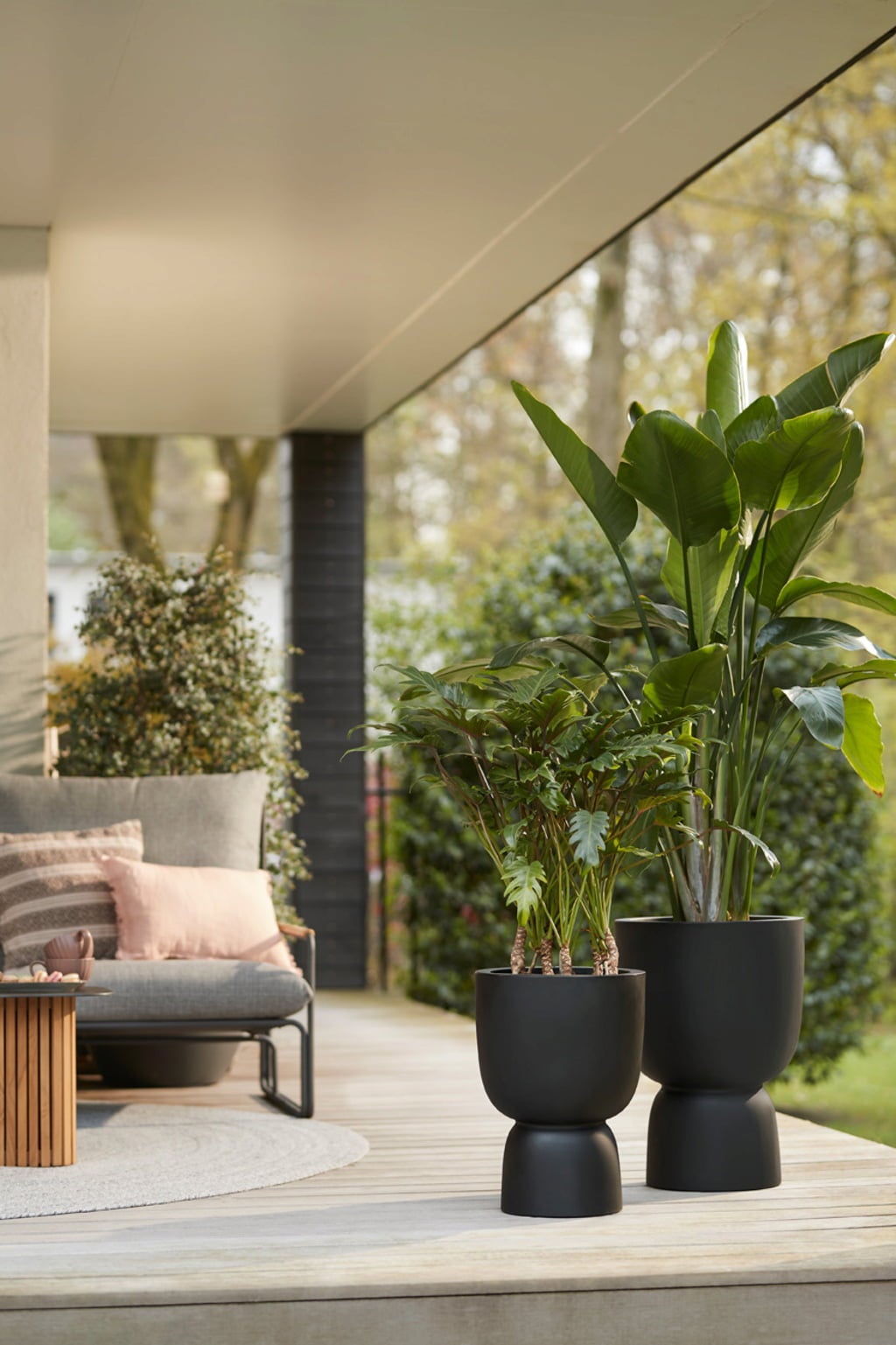 Ta elegantni lonec je izrazit kos za dom in vrt, ki ga ne gre podcenjevati. Podstavek poveča višino rastlin in jih naredi bolj bogate. Ker laskave konture dajo loncu nekaj mehkega, se brezhibno zlije z okolico.