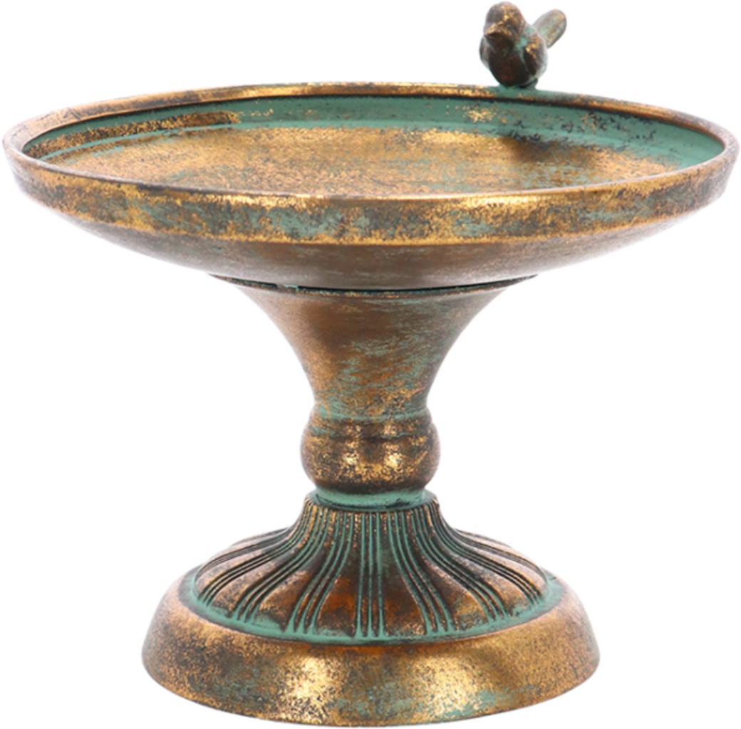 Privoščite svojim pernatim gostom to kompaktno ptičjo kopel iz starane kovine. Narejena je iz robustnega litega železa, ima eleganten starinski videz in je odporna na vremenske vplive. Klasična oblika se še posebej dobro ujema s podeželskim ali industrijskim slogom vrta ter bo ptice in ljubitelje vrta razveseljevala še vrsto let.