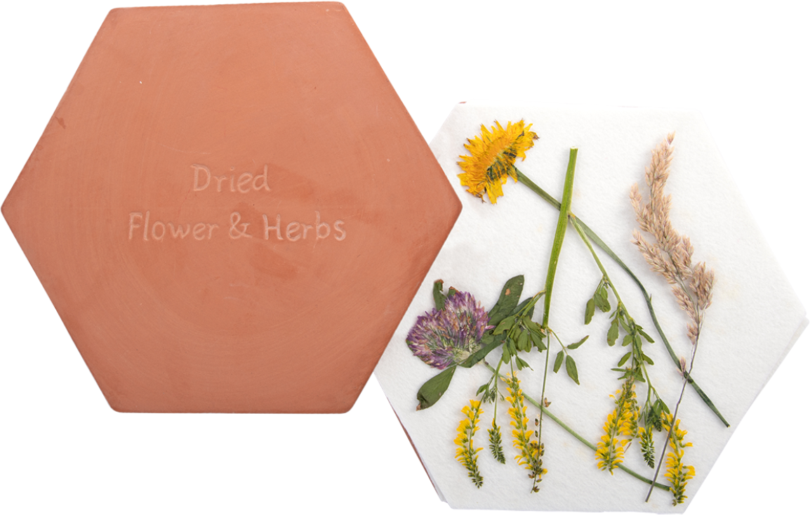 Izberite cvetove ali liste, ki jih želite posušiti. Na spodnjo ploščo iz terakote najprej položite ploščo iz filca. Poljubno postavite rože in liste. Zdaj postavite drugo ploščo iz klobučevine in nato zgornjo ploščo iz terakote. Vse plasti stiskalnice pritrdite s tremi silikonskimi trakovi. Nato v mikrovalovno pečico. Maks. 2 minuti pri 750 W za najboljši rezultat.