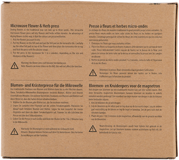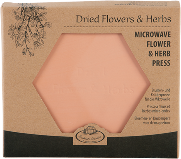 S pomočjo inovativne stiskalnice Mikrowelle za rože in zelišča lahko učinkovitost sušenja izjemno povečate: klasični postopek traja do tri tedne, uporaba tega izdelka pa dve do tri minute. Poleg prihranka časa ta metoda bolje ohranja barve rastlin.