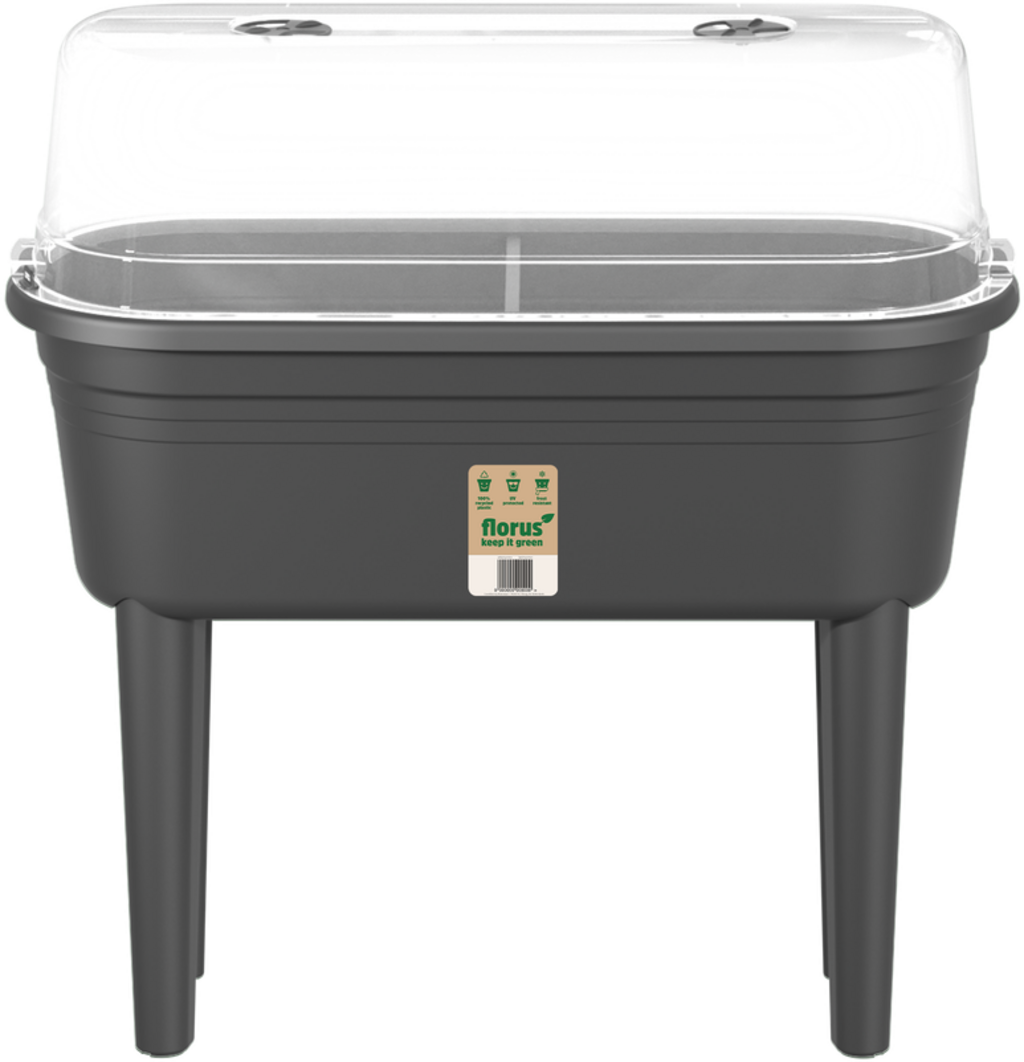 Grow Table Set znamke Florus je idealna rešitev za vse, ki želijo gojiti sveža zelišča, zelenjavo ali cvetje neposredno na balkonu, terasi ali vrtu, ne da bi se morali sklanjati. Z delovno višino 26,4 cm zagotavlja popolno udobje pri skrbi za rastline.