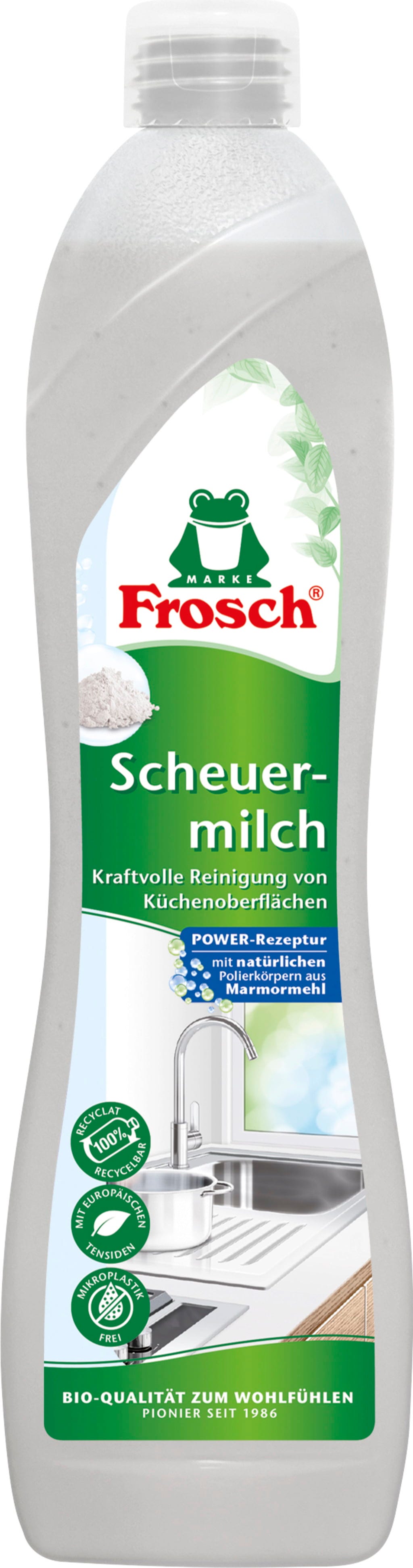 Frosch Aabrazivno mleko za čiščenje brez napora vnese nov sijaj v vašo kuhinjo in kopalnico! Izkorišča naravno moč finega marmornega prahu, ki mehansko polira površine in nežno, a učinkovito odstrani umazanijo iz nerjavečega jekla, emajla ali steklokeramike.