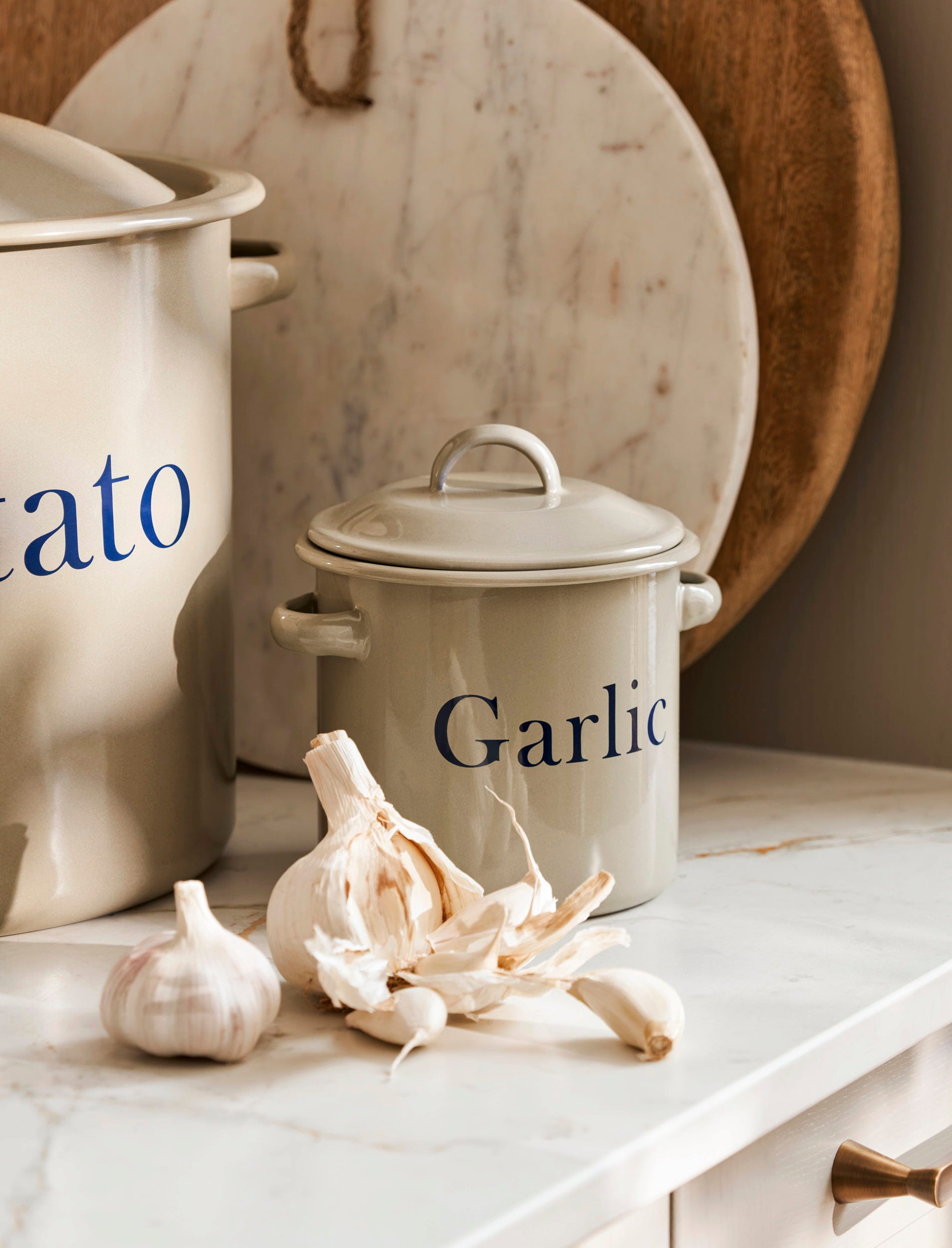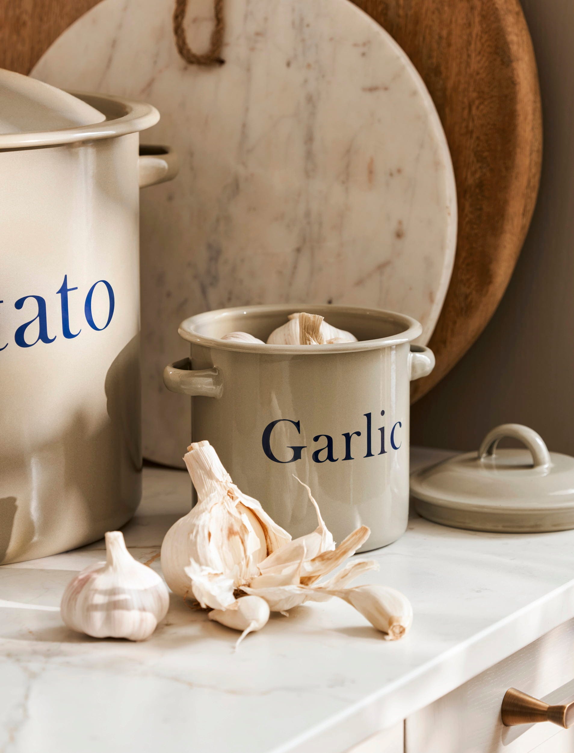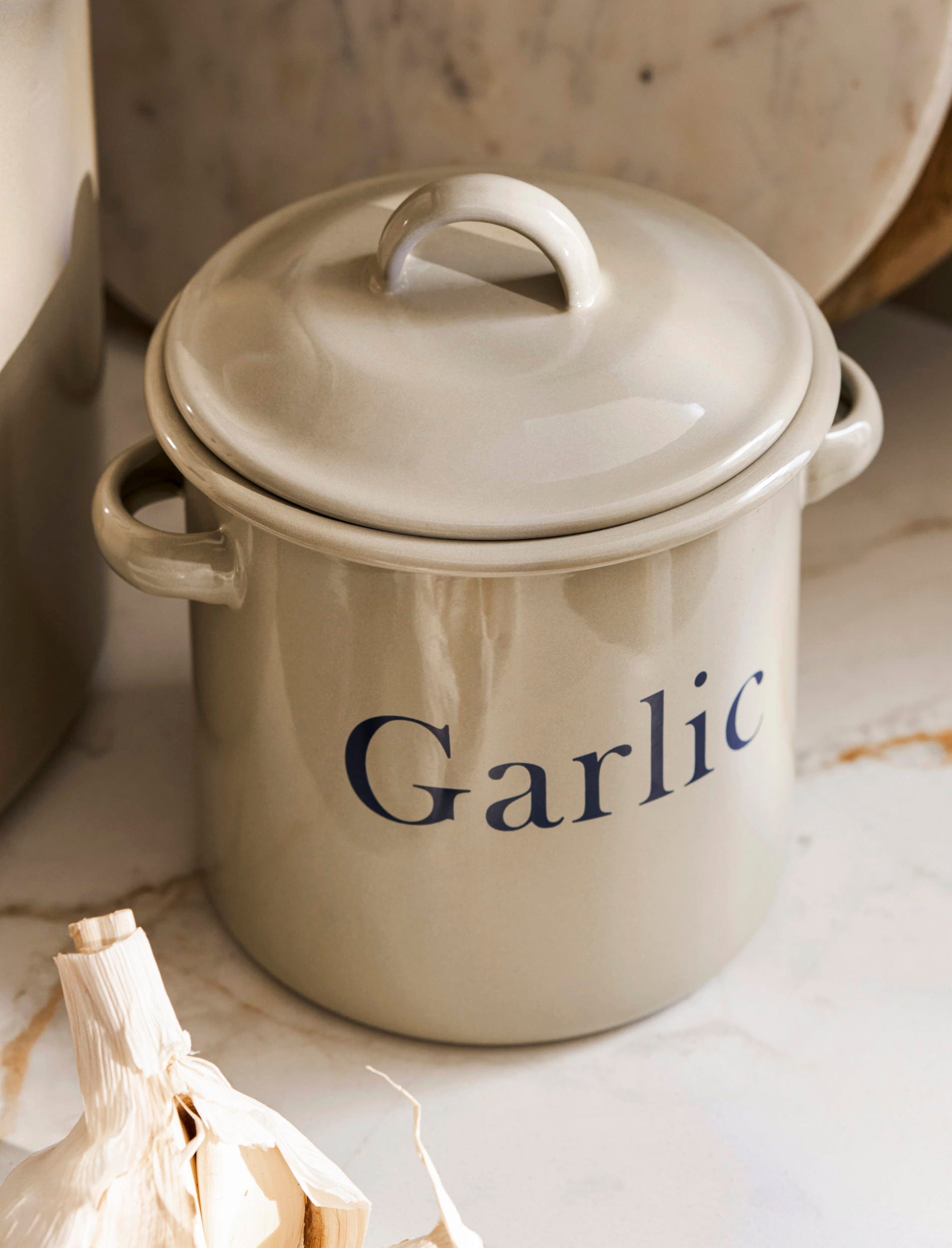 Posoda s pokrovom in dvema ročajema navdušuje s svojo klasično obliko v topli bež barvi in ponuja veliko prostora za cele stroke česna, ki bodo dolgo ostali sveži. To je še posebej estetski način za organizacijo shrambe.