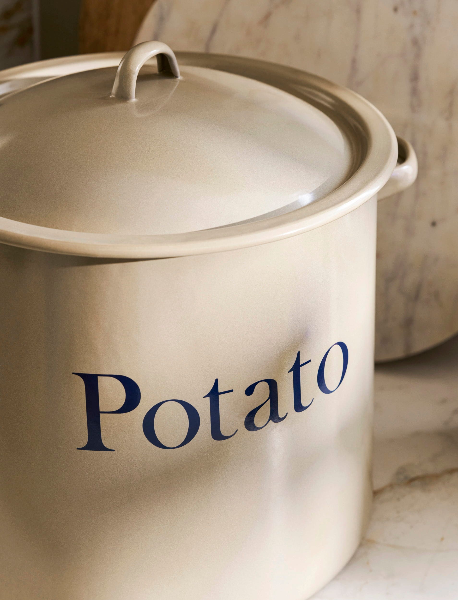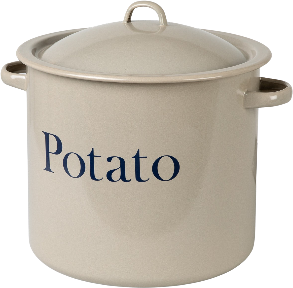Ta emajlirana posoda za krompir z privlačnim vintage dizajnom ohranja vaš krompir svež in doda estetski pridih vašemu domu. Zagotavlja optimalne pogoje shranjevanja krompirja in podaljšuje njegov rok uporabe. Opremljena je z dvema ročajema in pokrovom, zato je še posebej praktična.