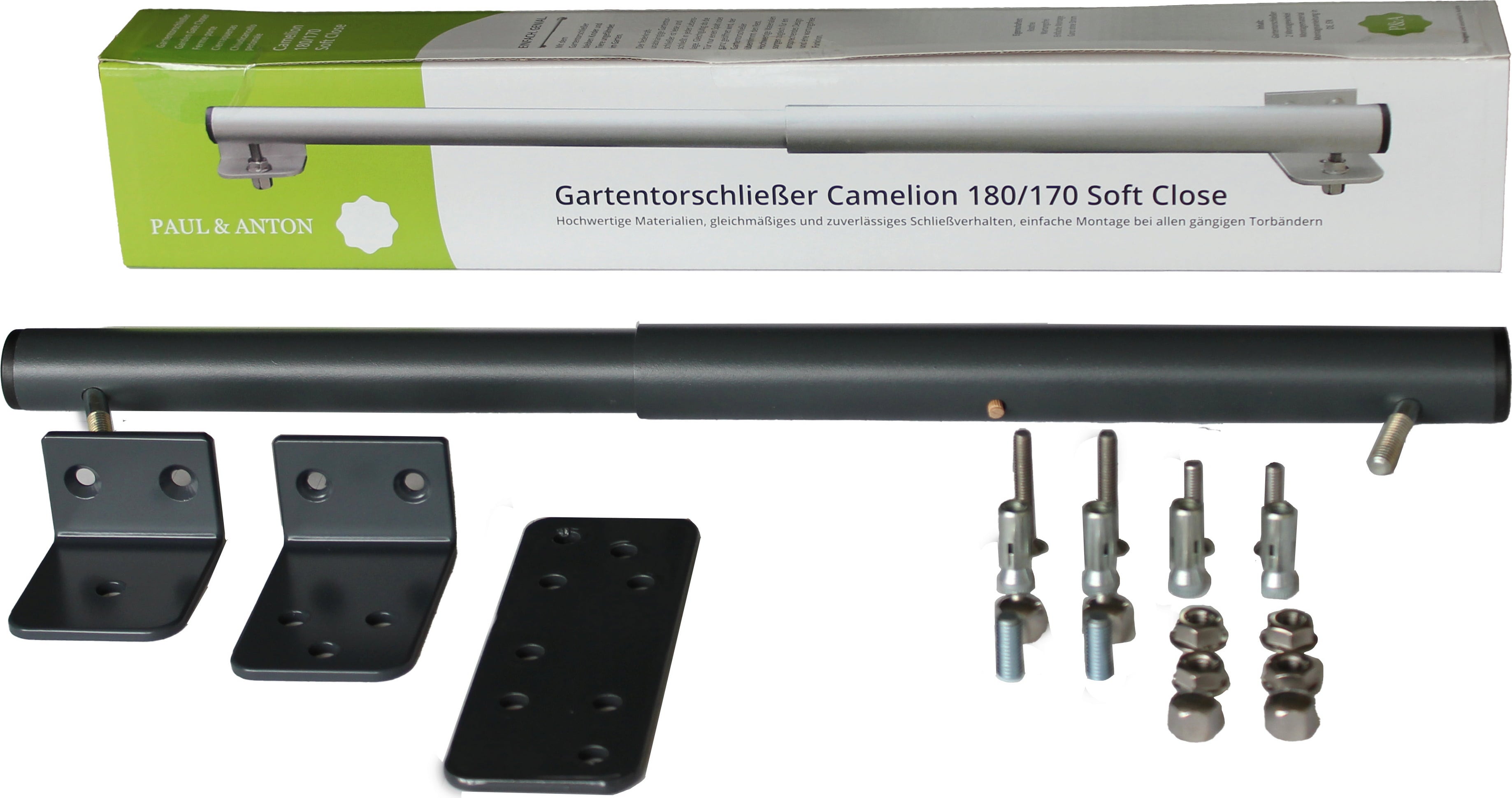 Gartentorschliesser Zapiralo za vrtna vrata Camelion 180/170 Soft Close vključno s kompletom montažnih nosilcev, 80° kot, mat antracitno