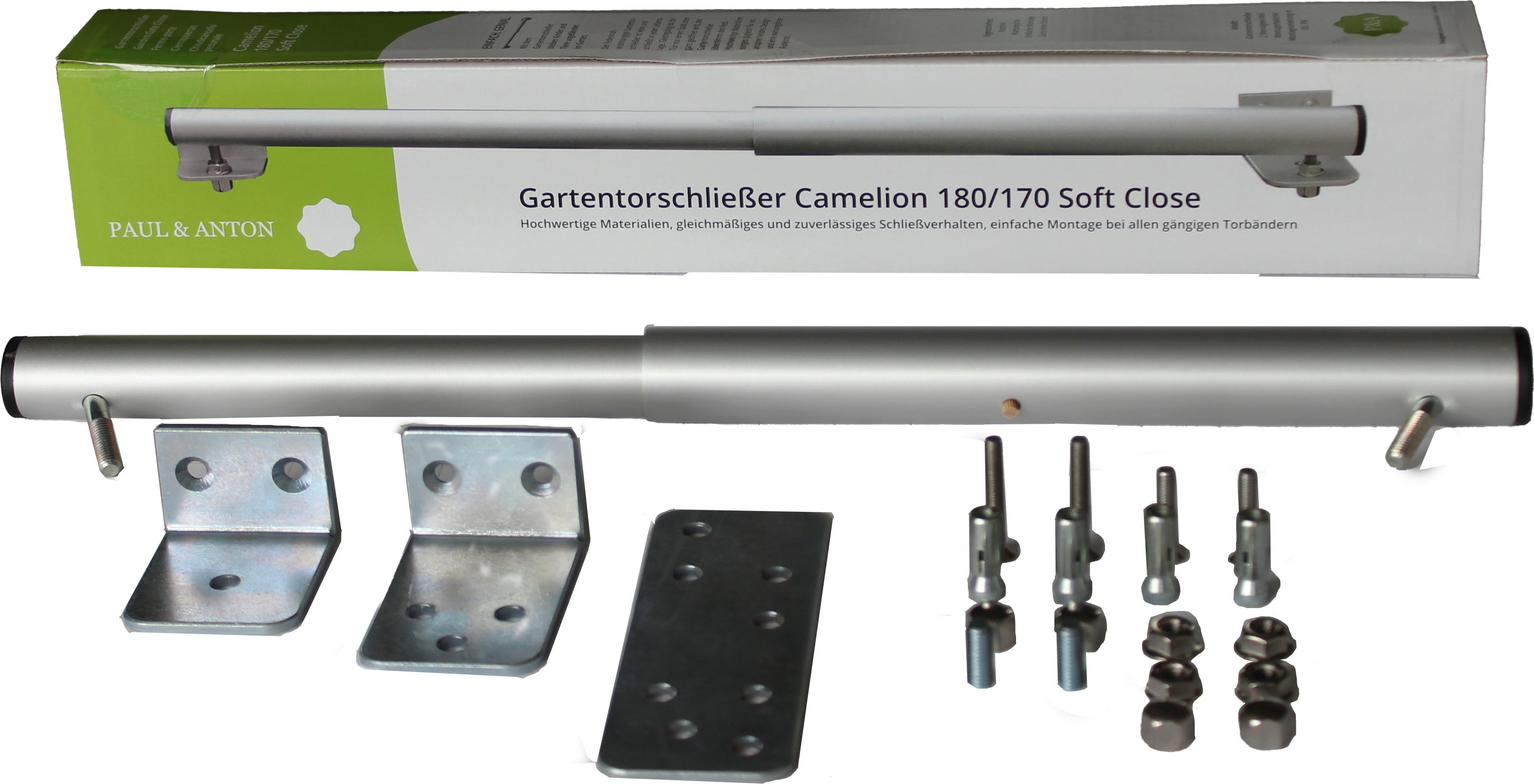 Gartentorschliesser Zapiralo za vrtna vrata Camelion 180/170 Soft Close vključno s kompletom montažnih nosilcev, 80° kot, srebrno