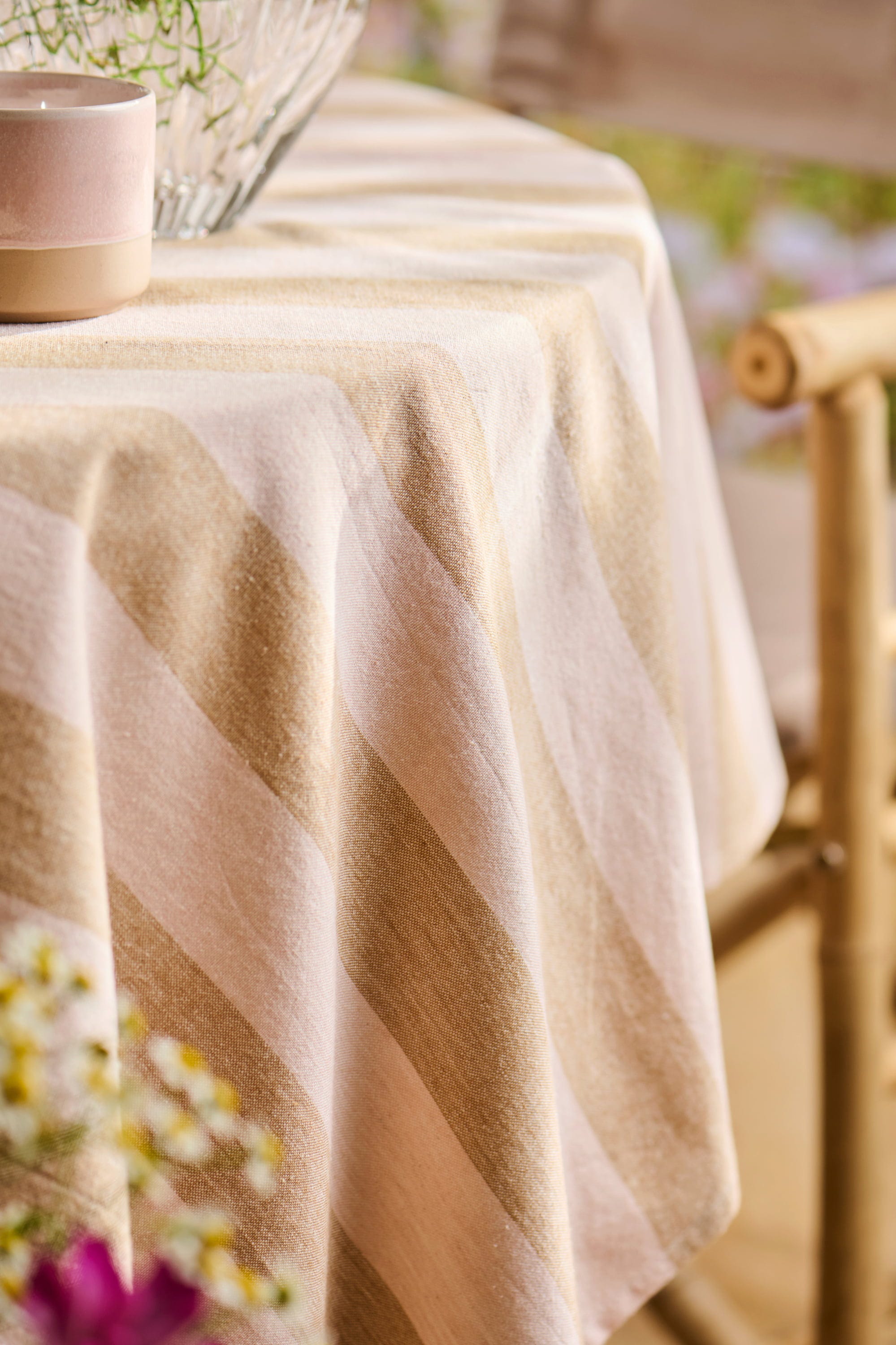 Ta namizni prt z lahkim materialom in nežnimi barvami sorbeta v trenutku ustvari poletni pridih. Kot nalašč za zajtrk na balkonu ali večerno peko na žaru z najdražjimi.