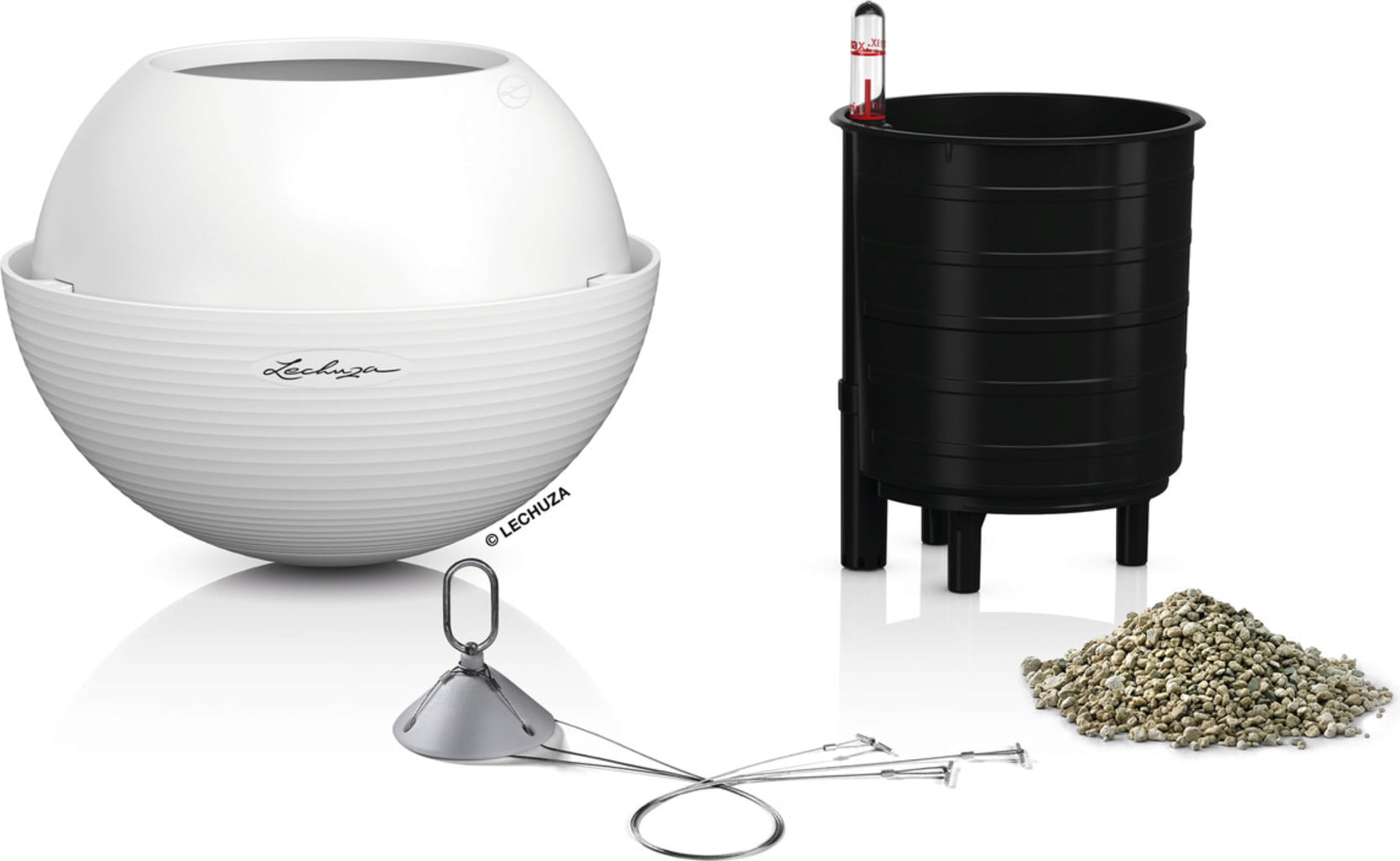 Set vsebuje: okrasni lonec, vložek za rastline, patentirani sistem zalivanja Lechuza in nosilec iz nerjavečega jekla