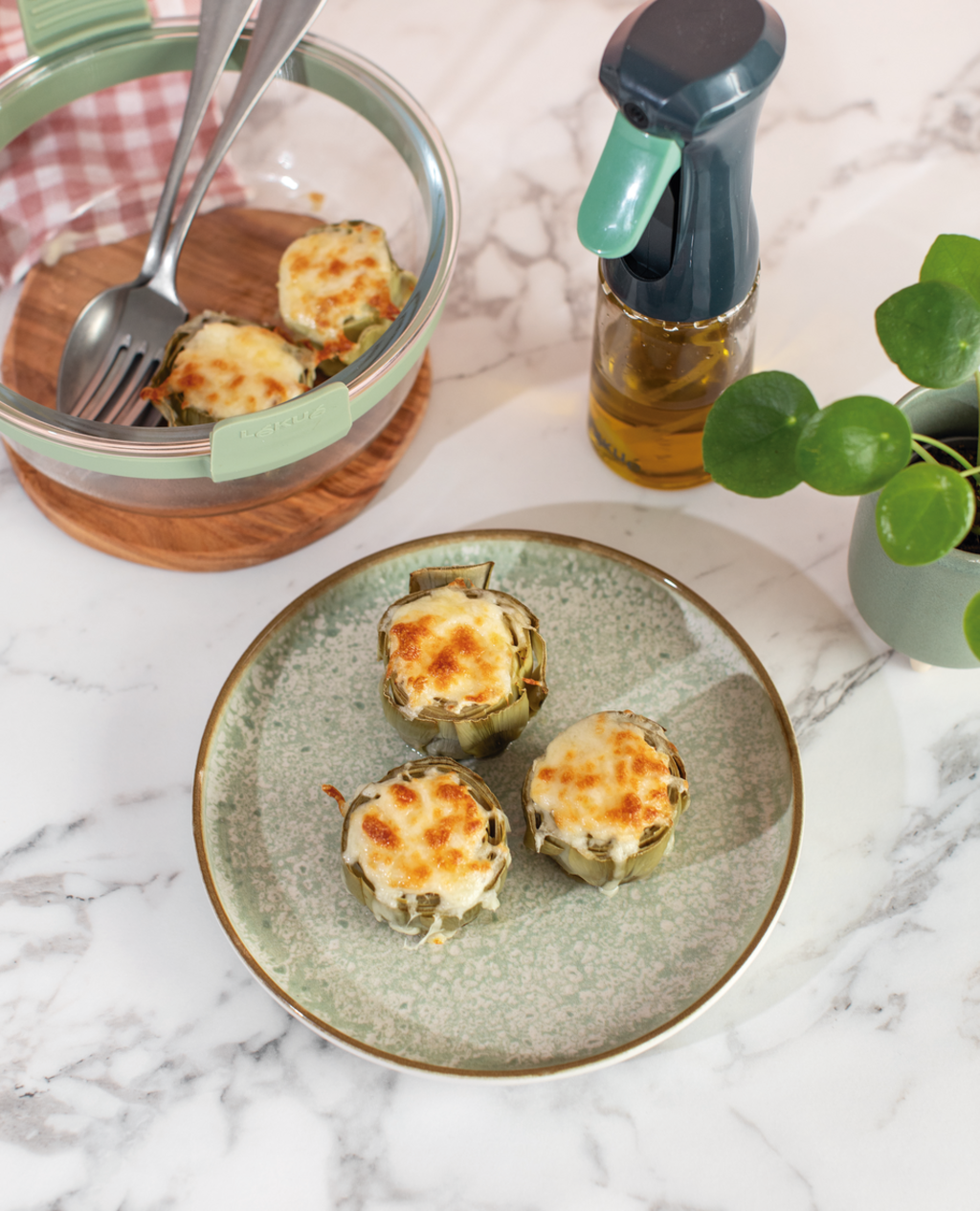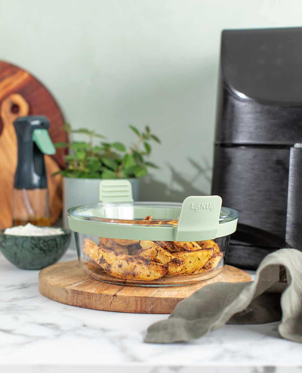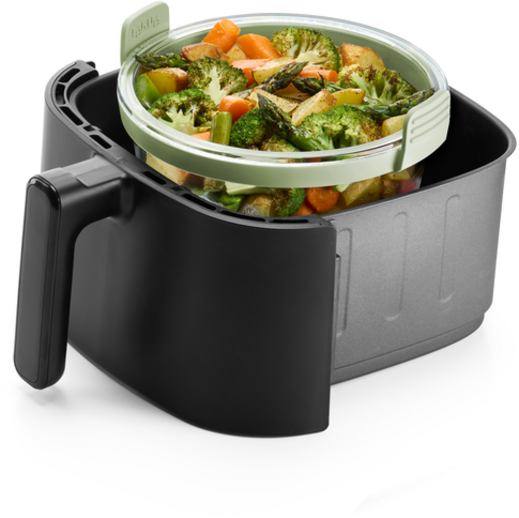 Ta pametna večnamenska posoda, izdelana iz robustnega borosilikatnega stekla, ni popolna le za nežno kuhanje v cvrtniku na vroč zrak, temveč se lahko uporablja tudi v pečici ali mikrovalovni pečici. Zahvaljujoč minimalistični zasnovi z odstranljivimi ročaji se lahko uporablja tudi za serviranje neposredno na mizo.