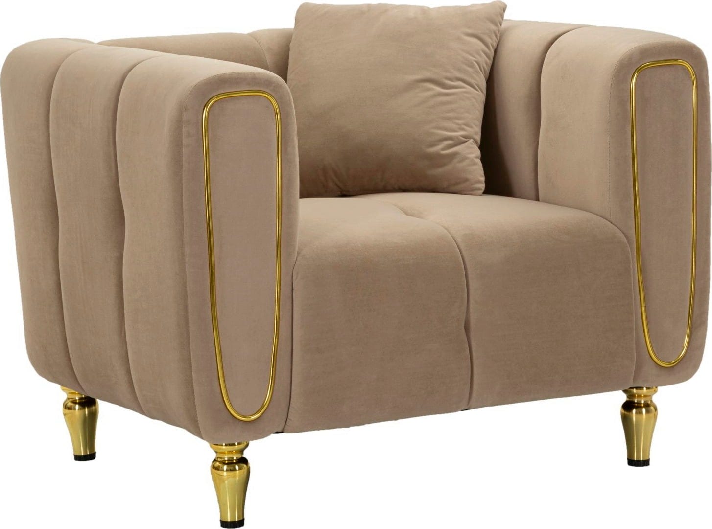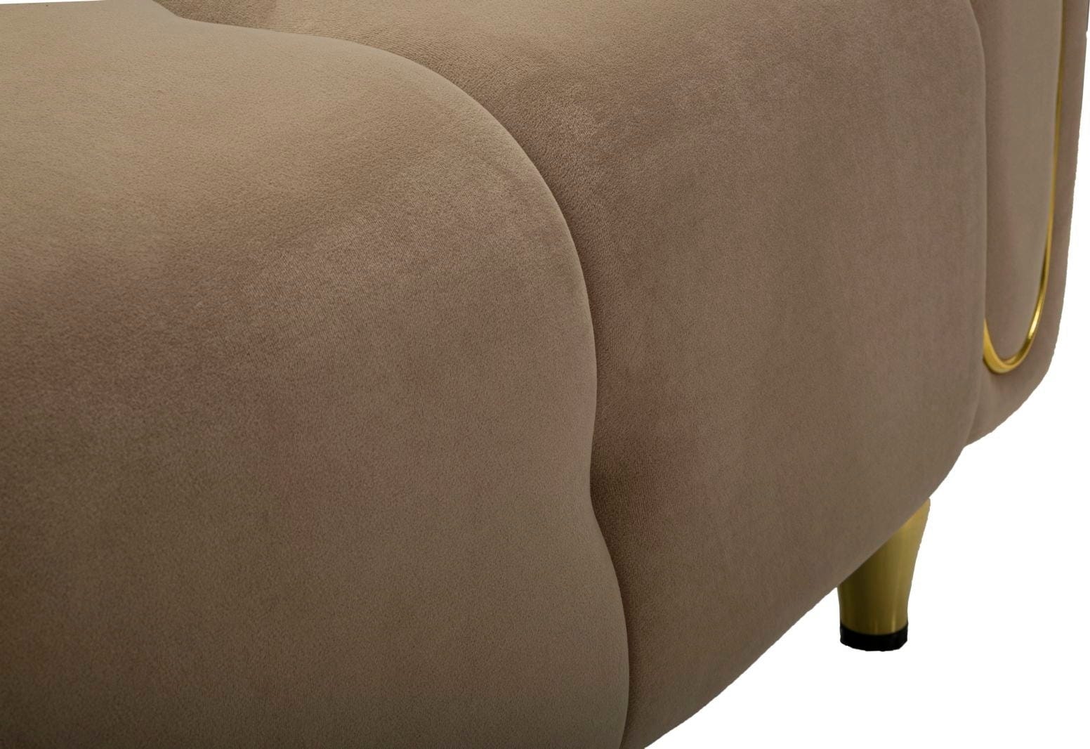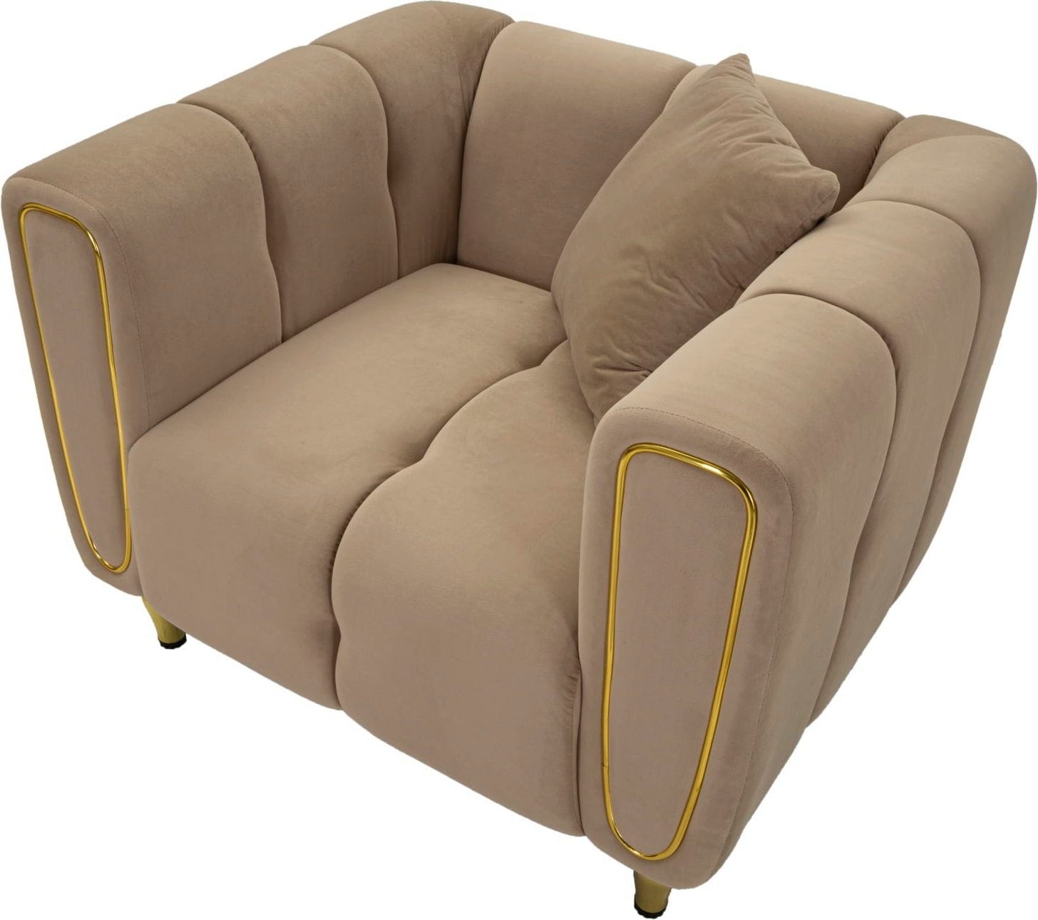 Ukrivljene naslone za roke elegantno poudarjajo bleščeči zlati detajli. Fotelj podpirajo kratke, okrogle zlate noge, ki odlično dopolnjujejo njegov sodoben in razkošen videz. Ta fotelj obljublja izjemno udobje in je idealen dodatek k sodobnim, elegantnim notranjostim, ki cenijo tako slog kot udobje.