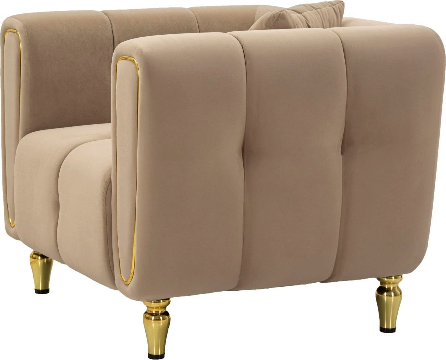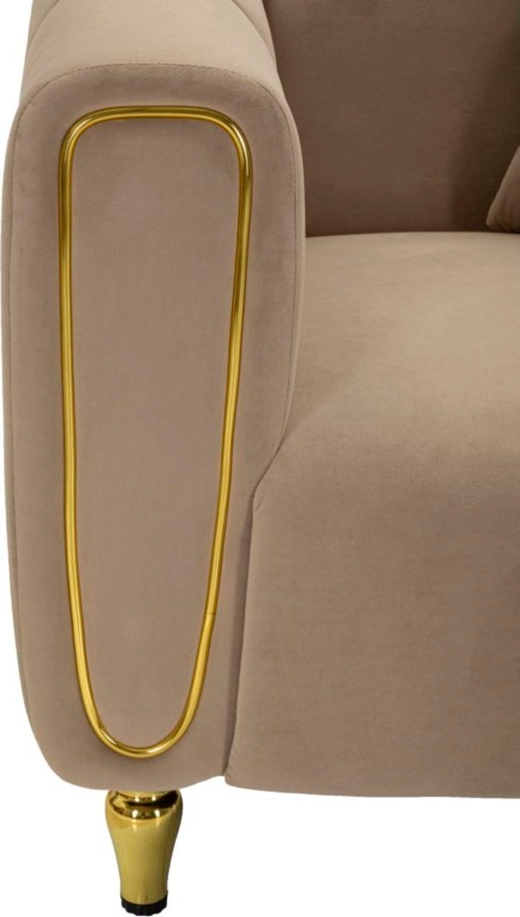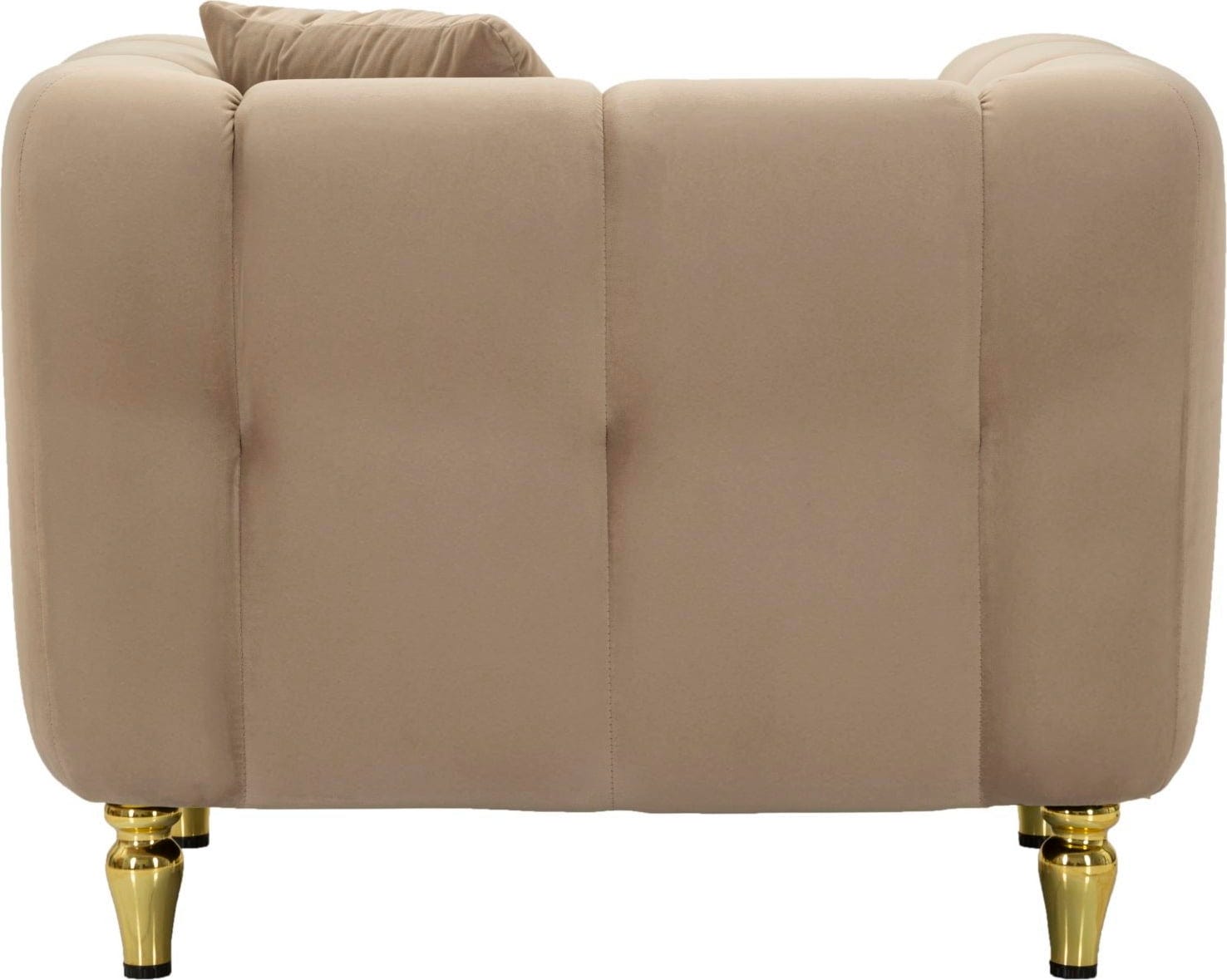 Ukrivljene naslone za roke elegantno poudarjajo bleščeči zlati detajli. Fotelj podpirajo kratke, okrogle zlate noge, ki odlično dopolnjujejo njegov sodoben in razkošen videz. Ta fotelj obljublja izjemno udobje in je idealen dodatek k sodobnim, elegantnim notranjostim, ki cenijo tako slog kot udobje.
