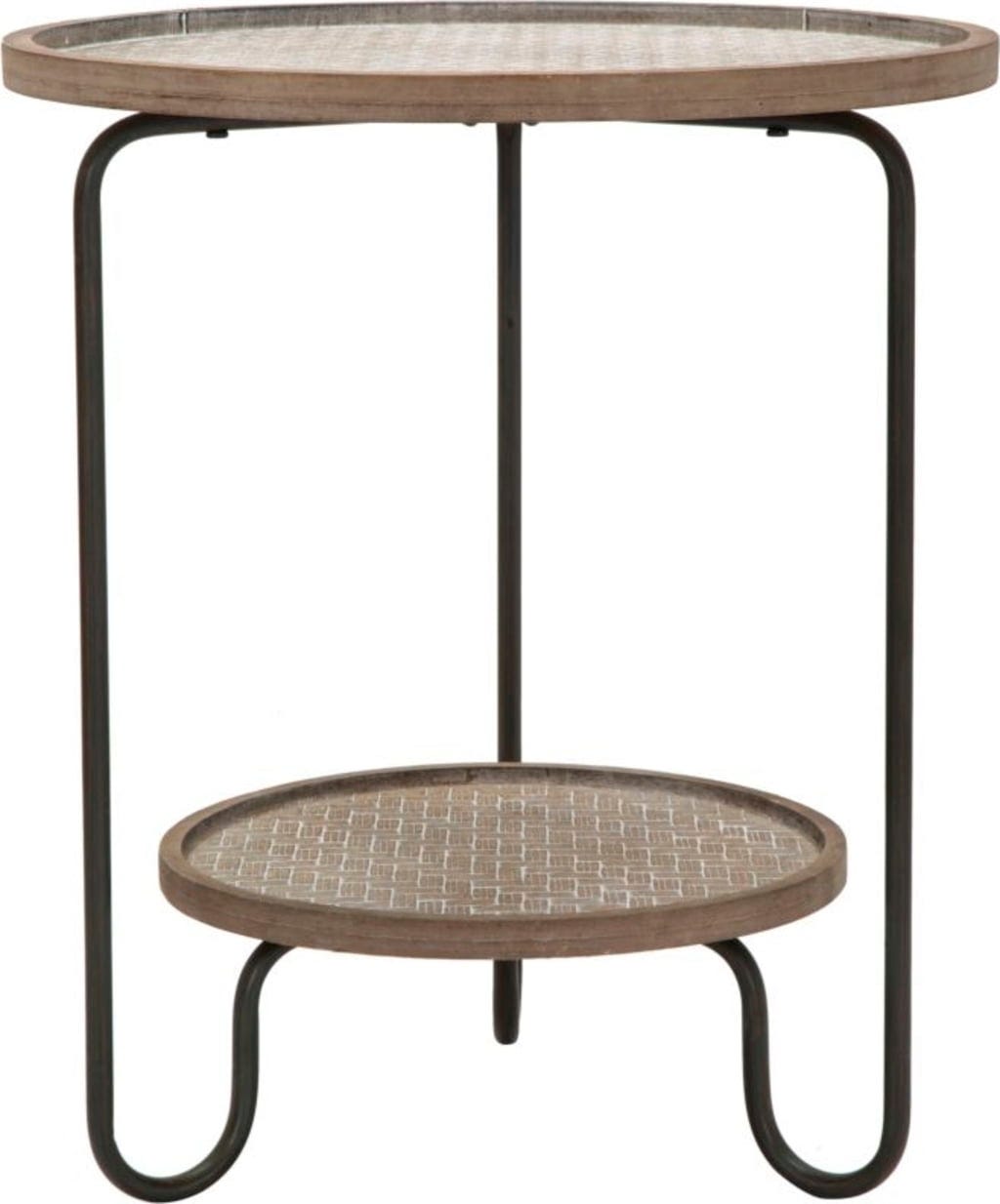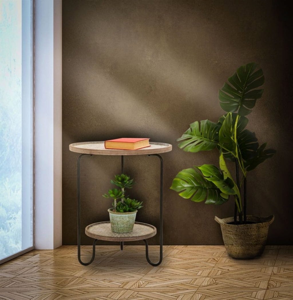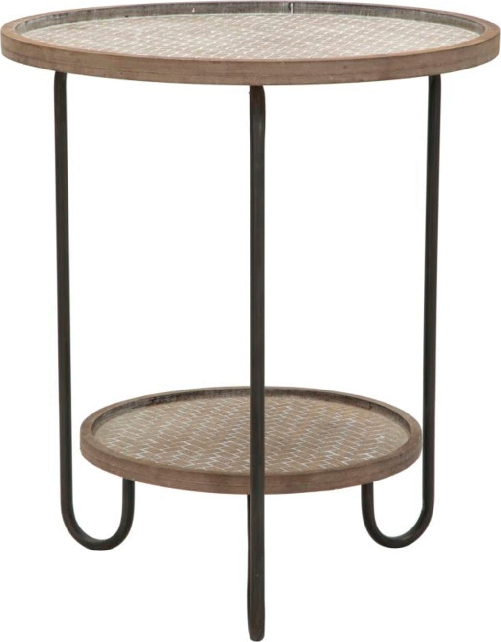 Miza ima dve okrogli polici: te so izdelane iz lesa in imajo sodoben tkan videz, ki ji doda topel, naraven pridih. Spodnja polica služi kot praktičen predal za revije ali daljinske upravljalnike.
