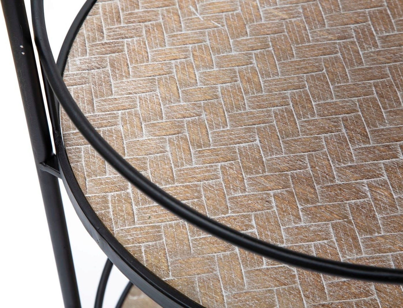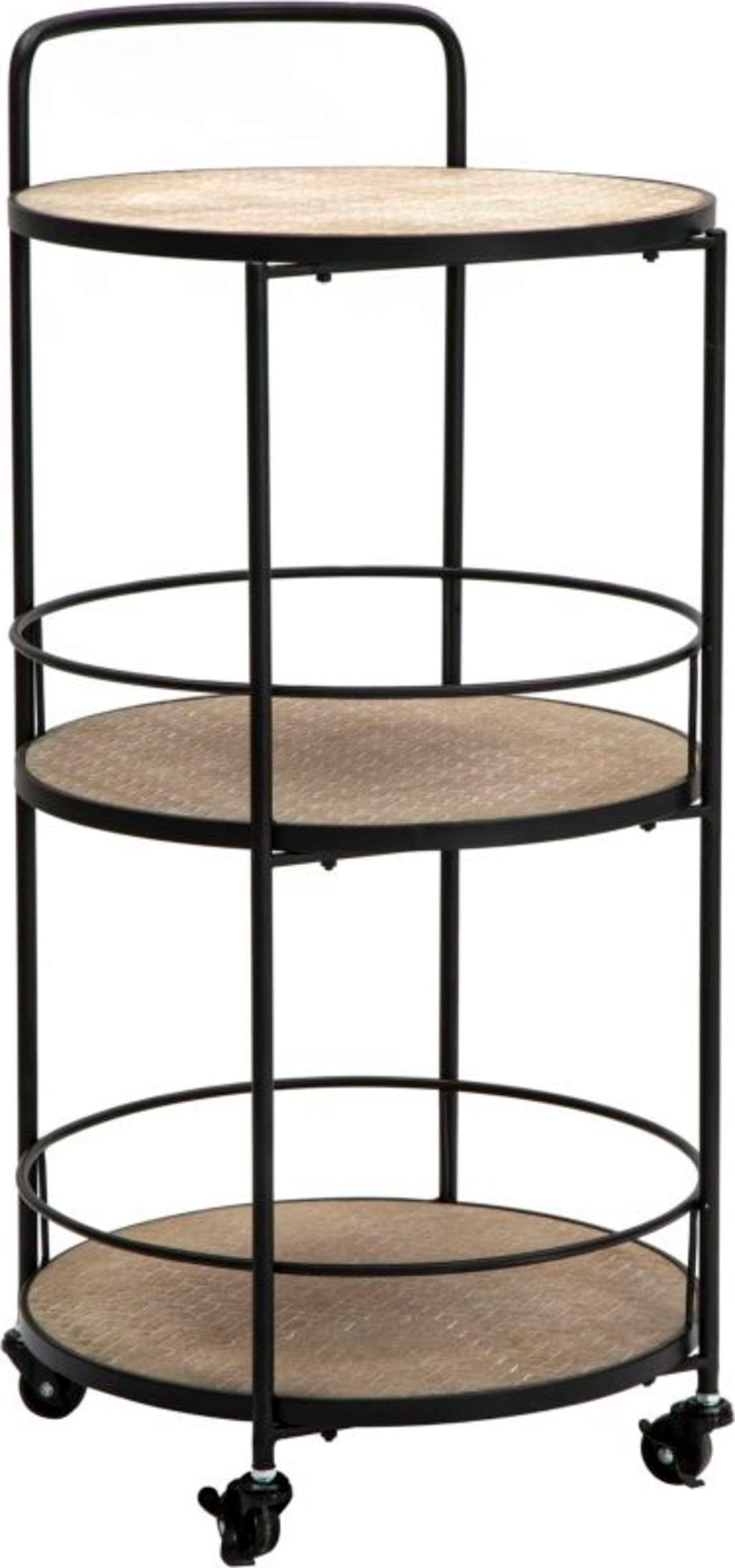Ta okrogli servirni voziček je popolna kombinacija praktične mobilnosti in elegantnega dizajna. Ima tri prostorne police, katerih leseni zgornji deli imajo sodoben tkan videz.