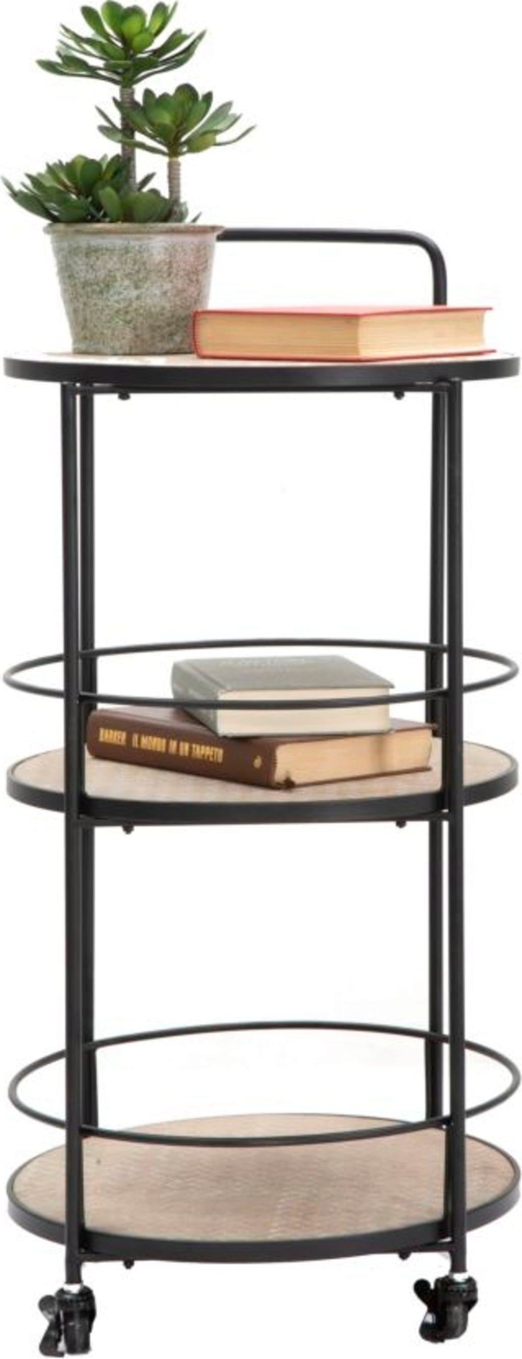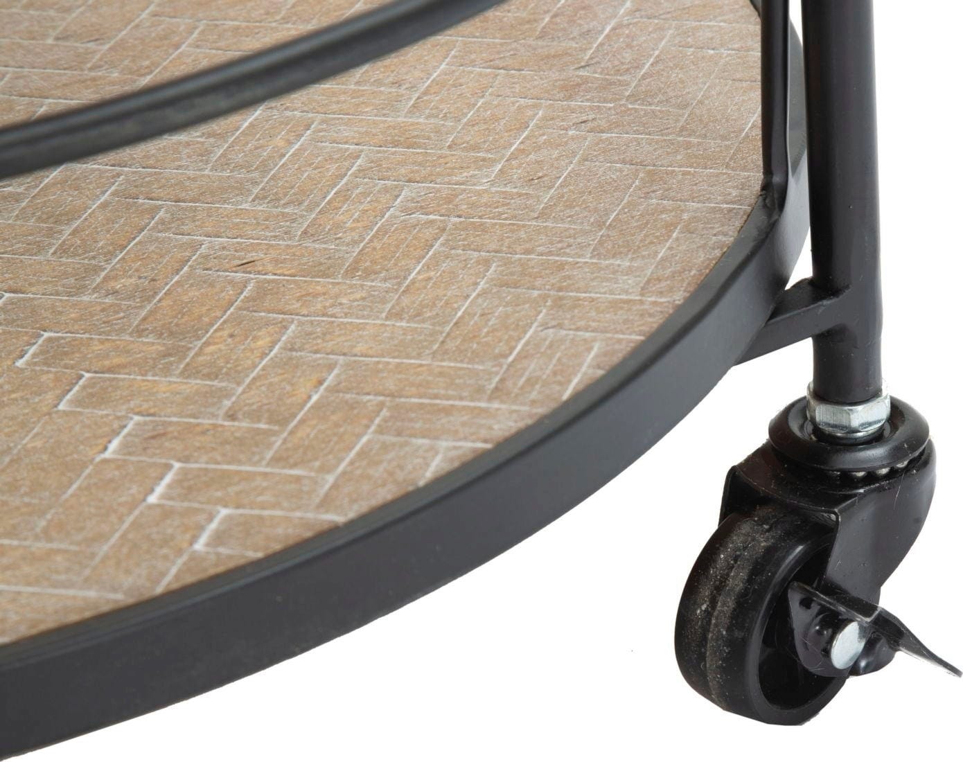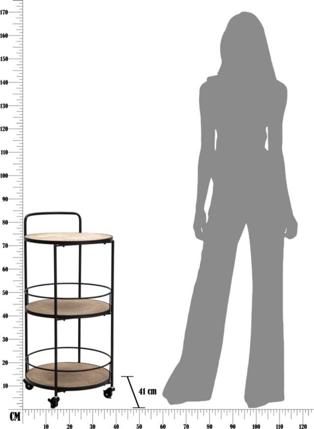 Okvir iz črne kovine opredeljuje preproste, a presenetljive linije, ki vozičku dajejo eleganten, a hkrati prizemljen videz. Zahvaljujoč praktičnim kolescem in ročaju lahko voziček brez težav premikate - idealen je za zabave ali kot elegantna barska polica.