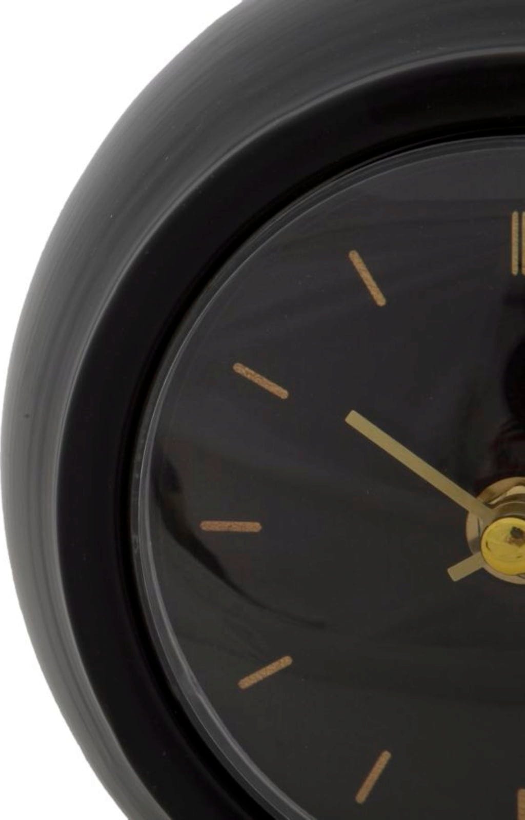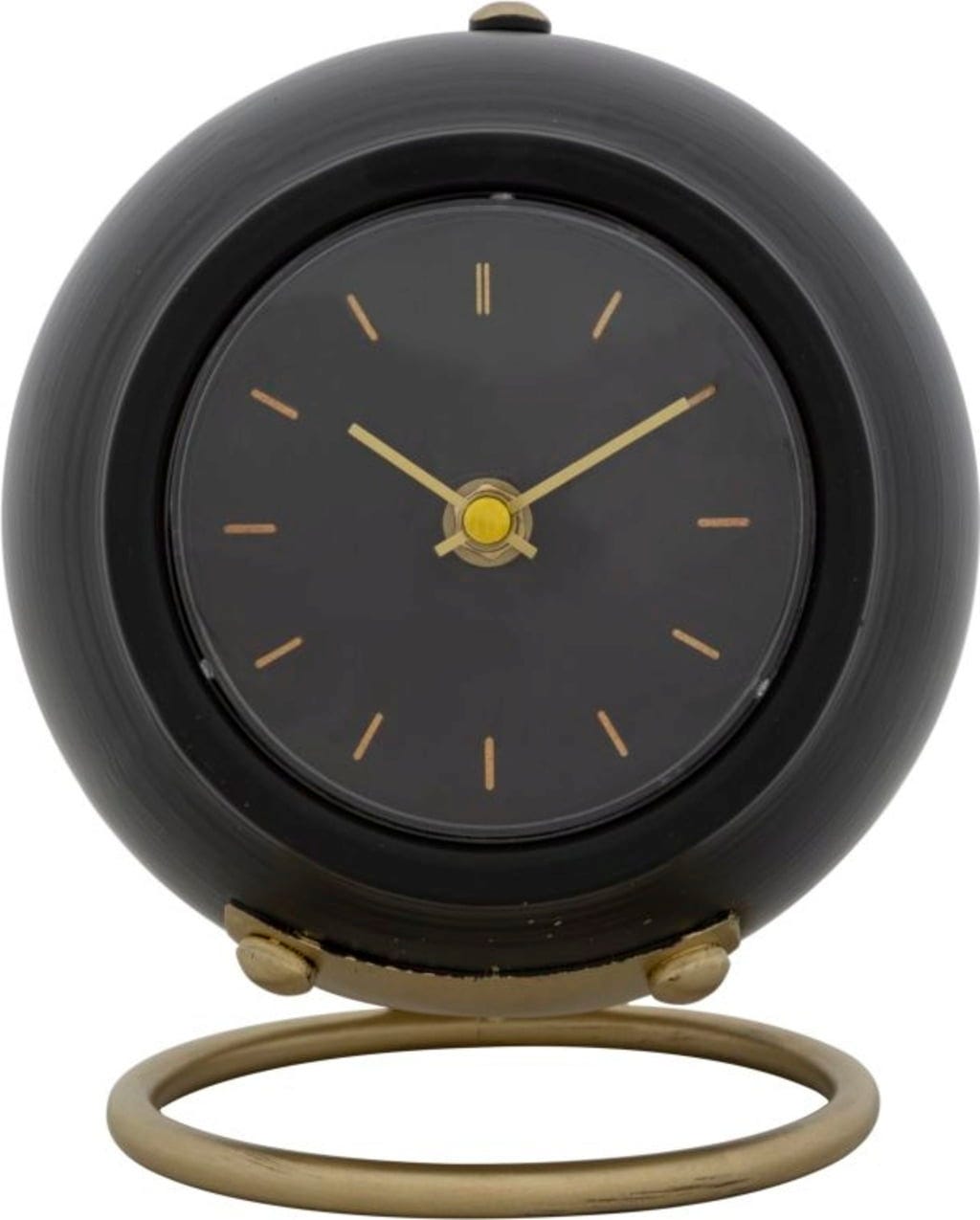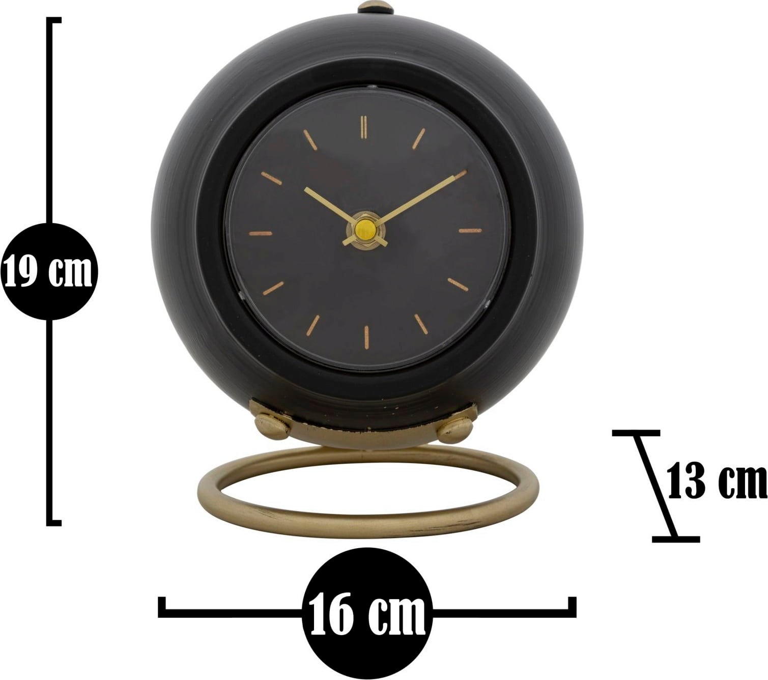 Minimalistično črno številčnico dopolnjujejo preprosti zlati kazalci in indeksi, zaradi česar je ura idealna dekoracija za katero koli vrsto pohištva.
