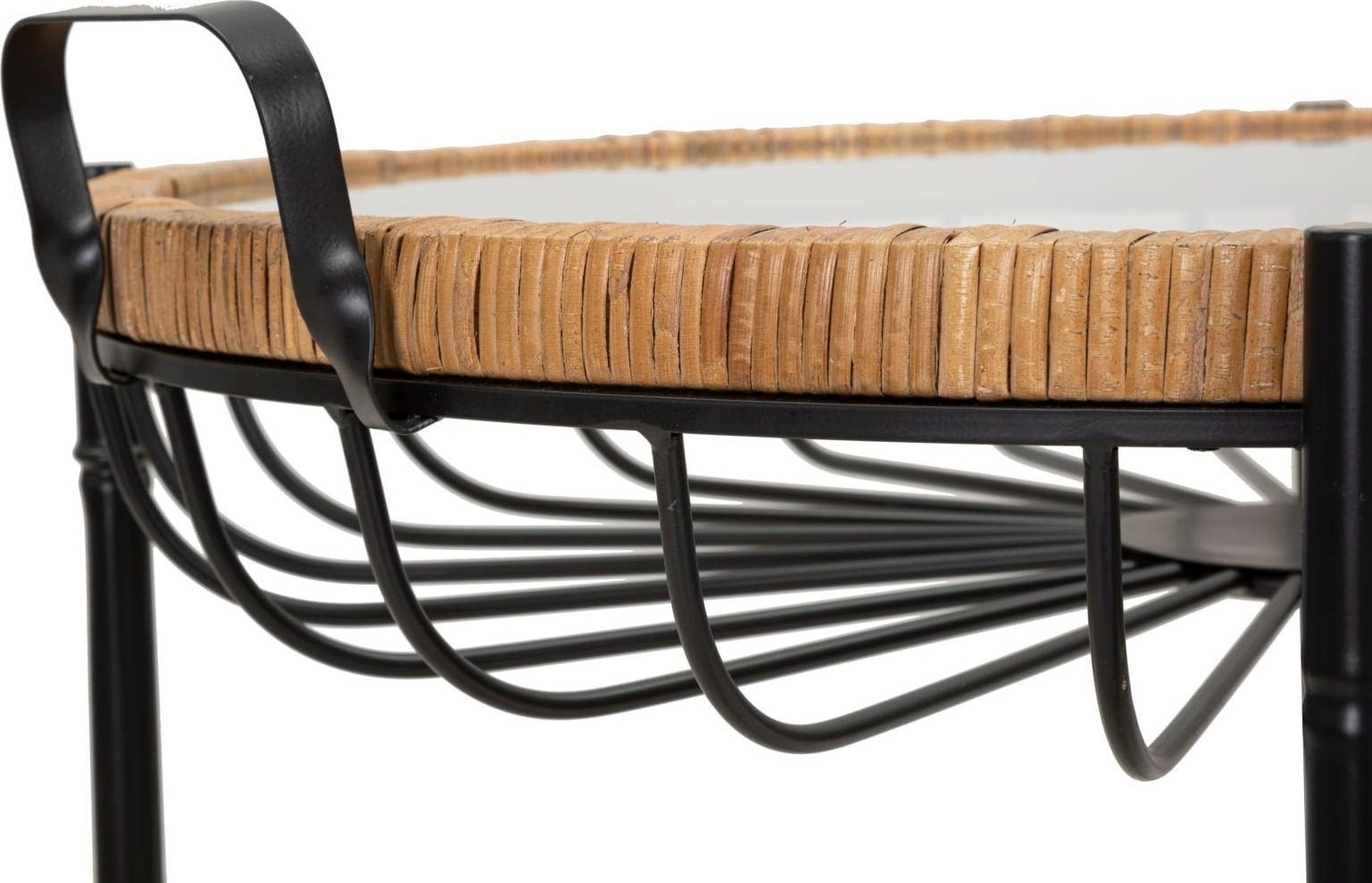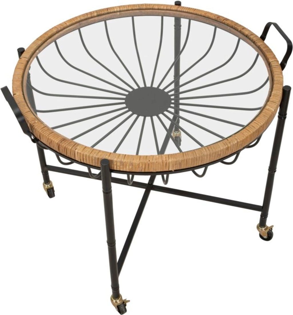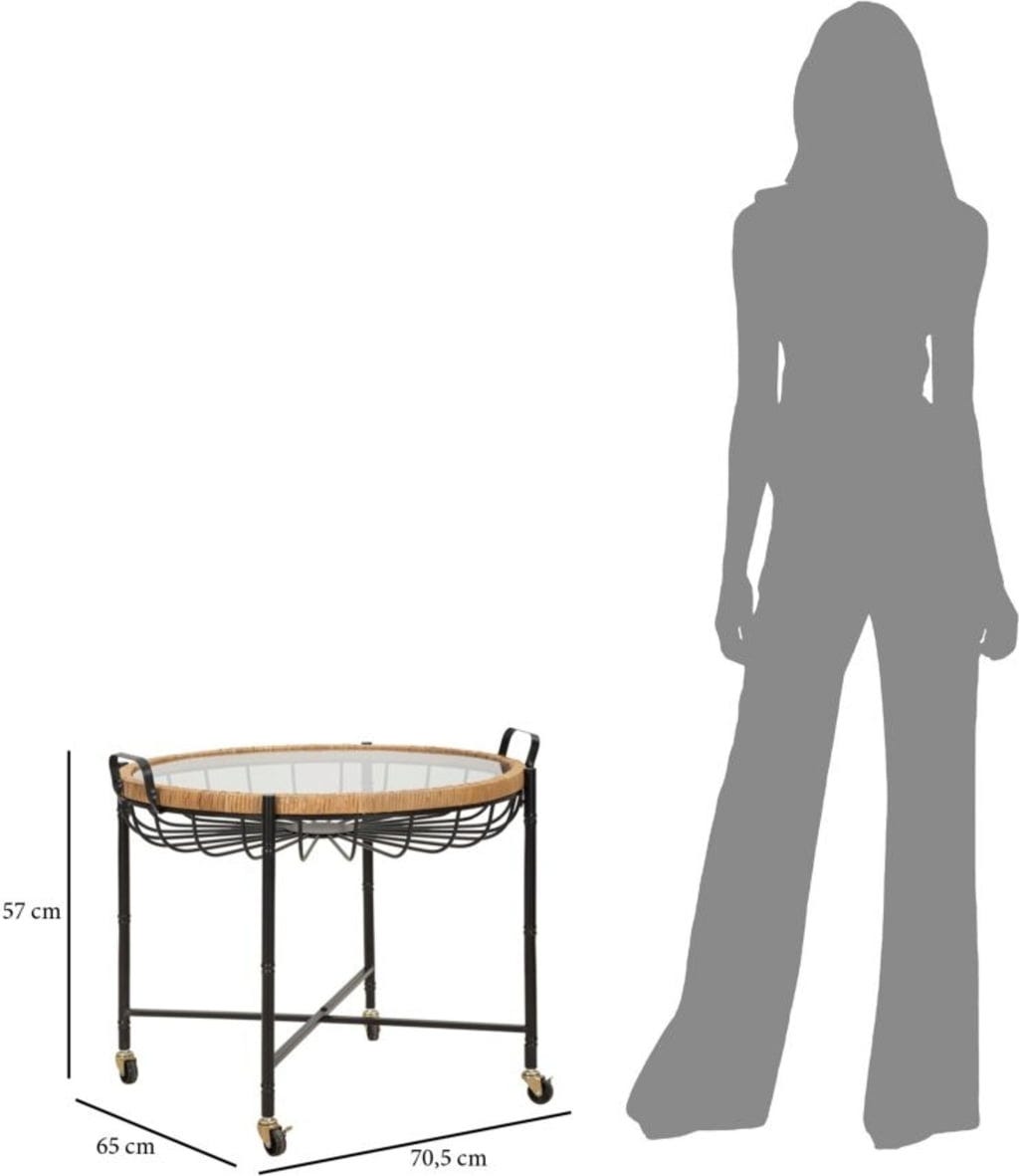 Vpadljiv okvir podpira elegantno stekleno površino, varno uokvirjeno z visokokakovostnim ratanom. Pod stekleno površino ukrivljeni kovinski nosilci tvorijo dekorativni vzorec, ki spominja na košaro in daje mizi posebno globino. Zaradi praktičnih kolesc in stranskih ročajev lahko mizo brez težav premikate in prilagodljivo uporabljate, kjer koli jo potrebujete.