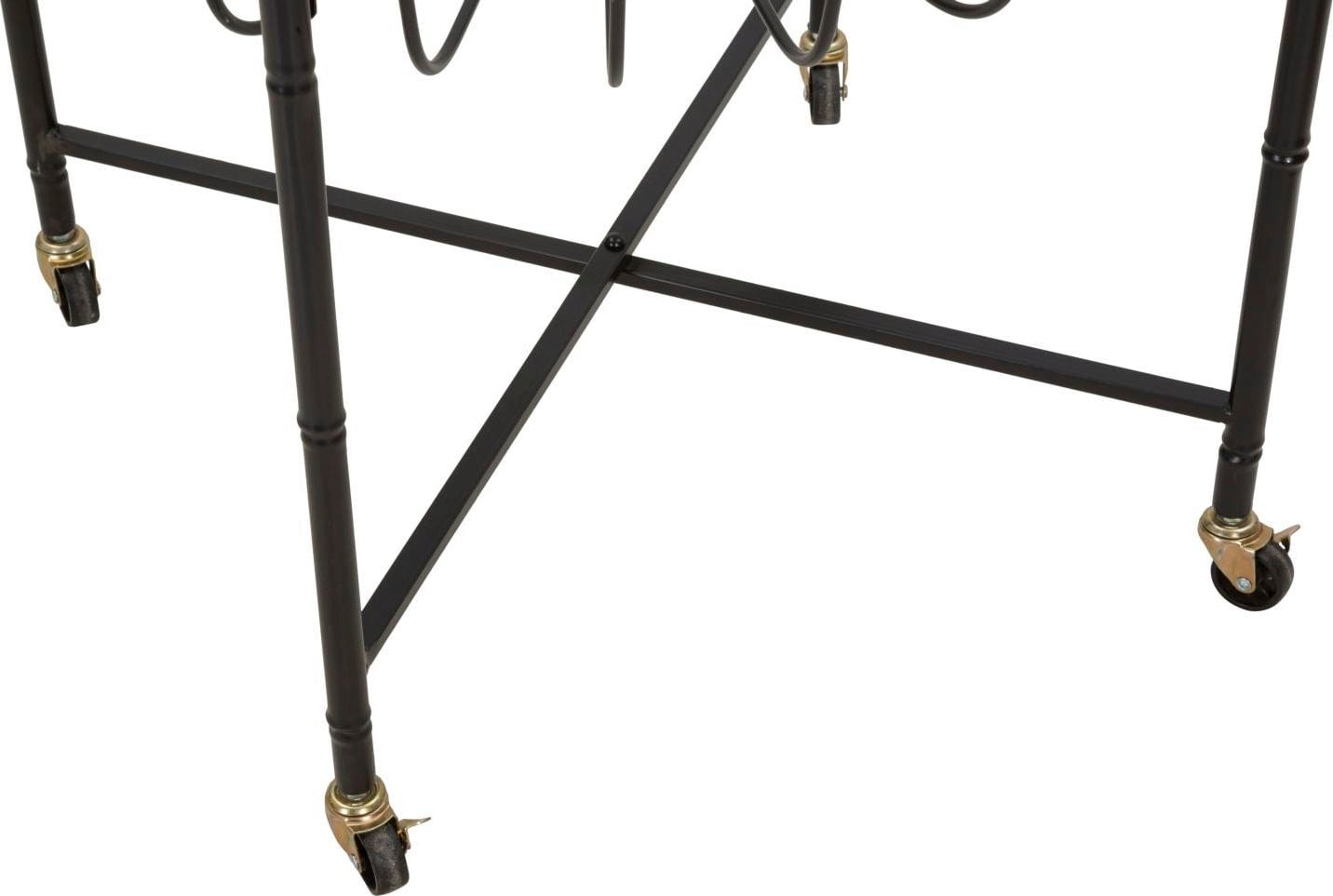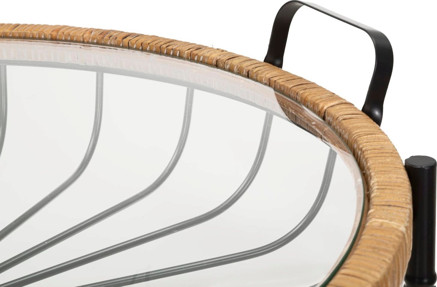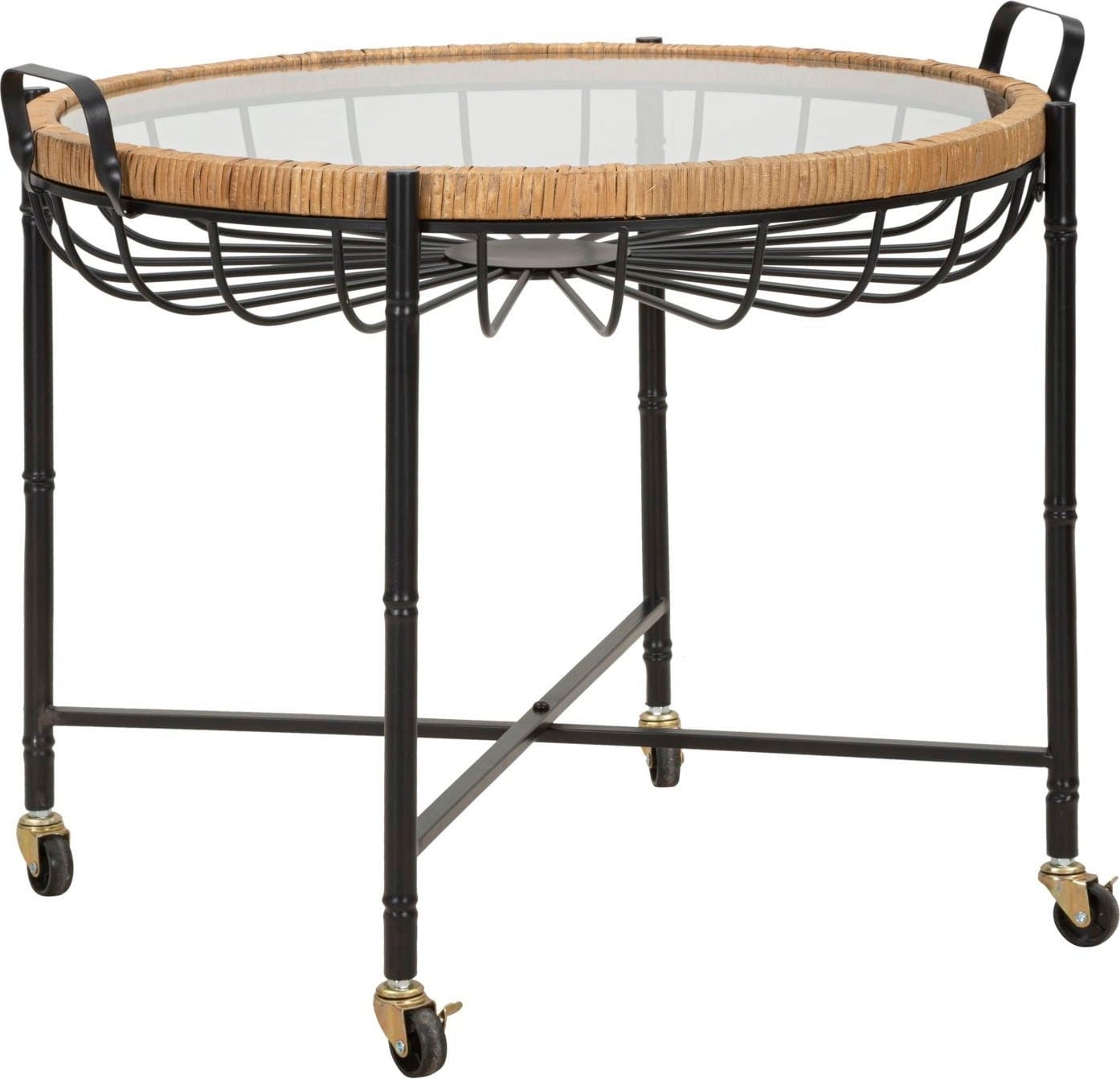Vpadljiv okvir podpira elegantno stekleno površino, varno uokvirjeno z visokokakovostnim ratanom. Pod stekleno površino ukrivljeni kovinski nosilci tvorijo dekorativni vzorec, ki spominja na košaro in daje mizi posebno globino. Zaradi praktičnih kolesc in stranskih ročajev lahko mizo brez težav premikate in prilagodljivo uporabljate, kjer koli jo potrebujete.