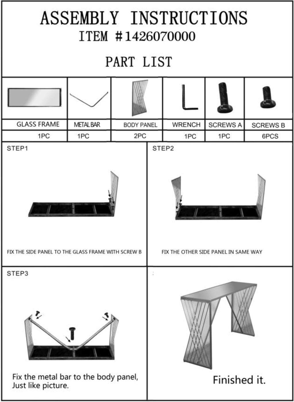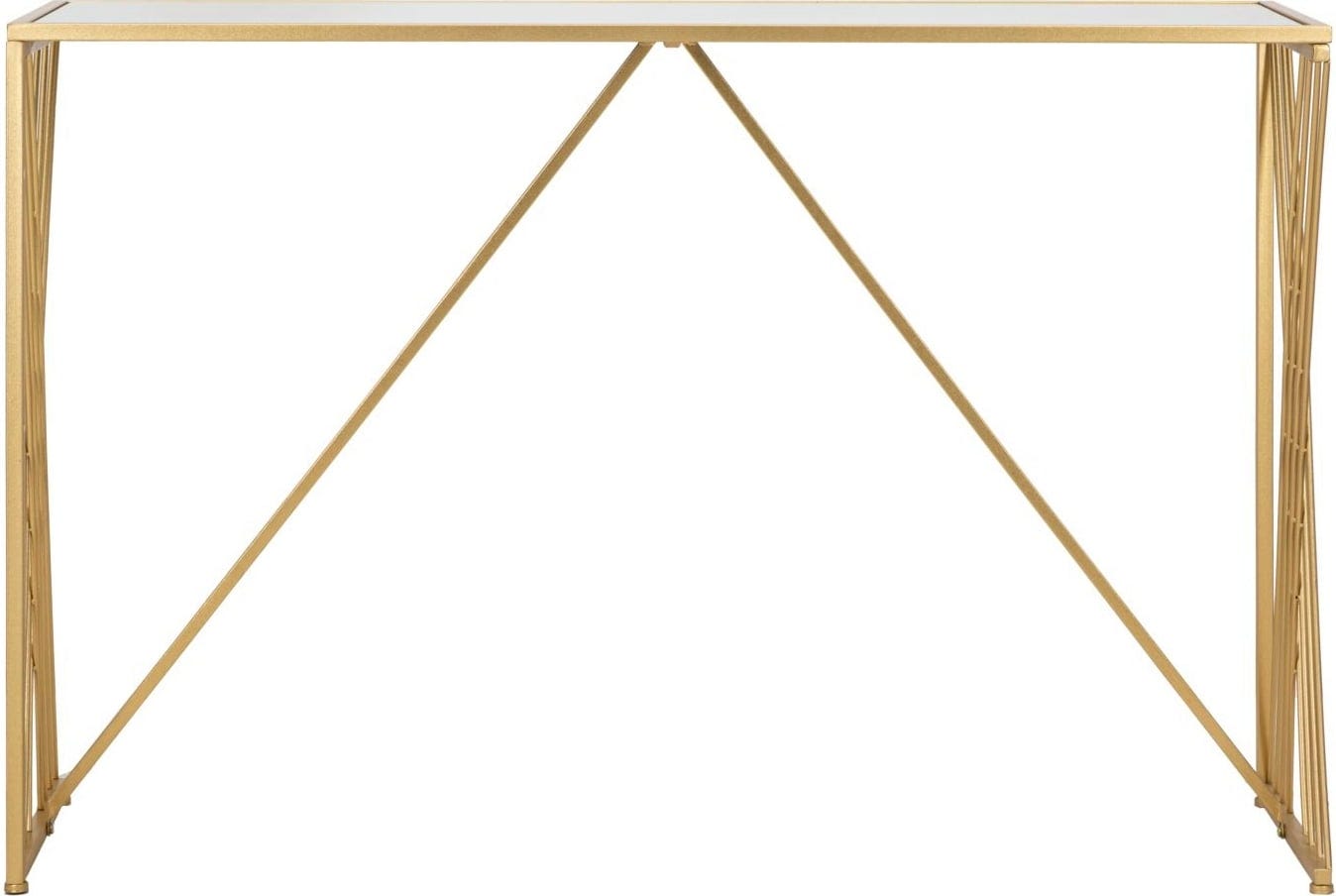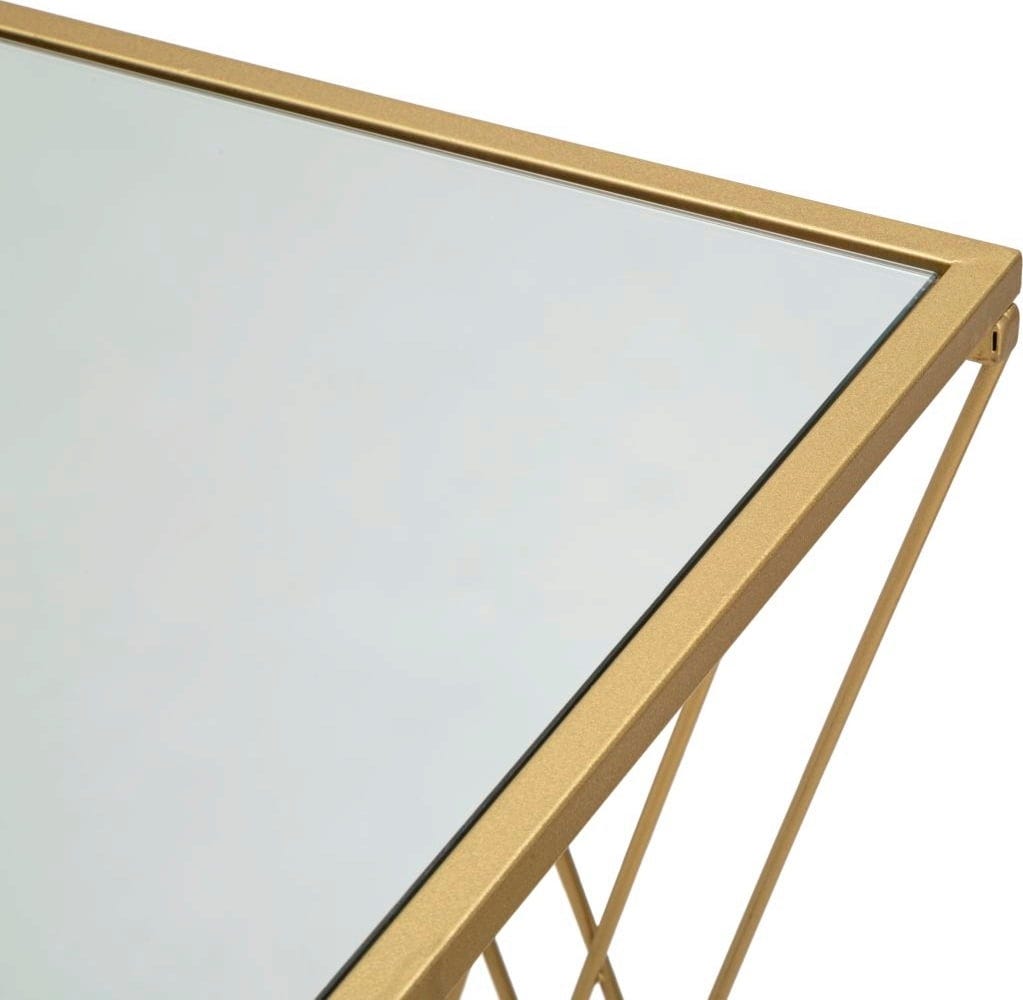 Dizajnerski vrhunec so nežne kovinske opore ob straneh, razporejene v prefinjen vzorec, ki dajejo kosu eleganco. Obliko dopolnjuje prefinjena zrcalna steklena plošča, ki odbija svetlobo in odlično prikazuje vaše dekorativne predmete. Zaradi svoje tanke oblike in zračne strukture se mizica harmonično vključi v vsak prostor, ne da bi ga vizualno preobremenila.