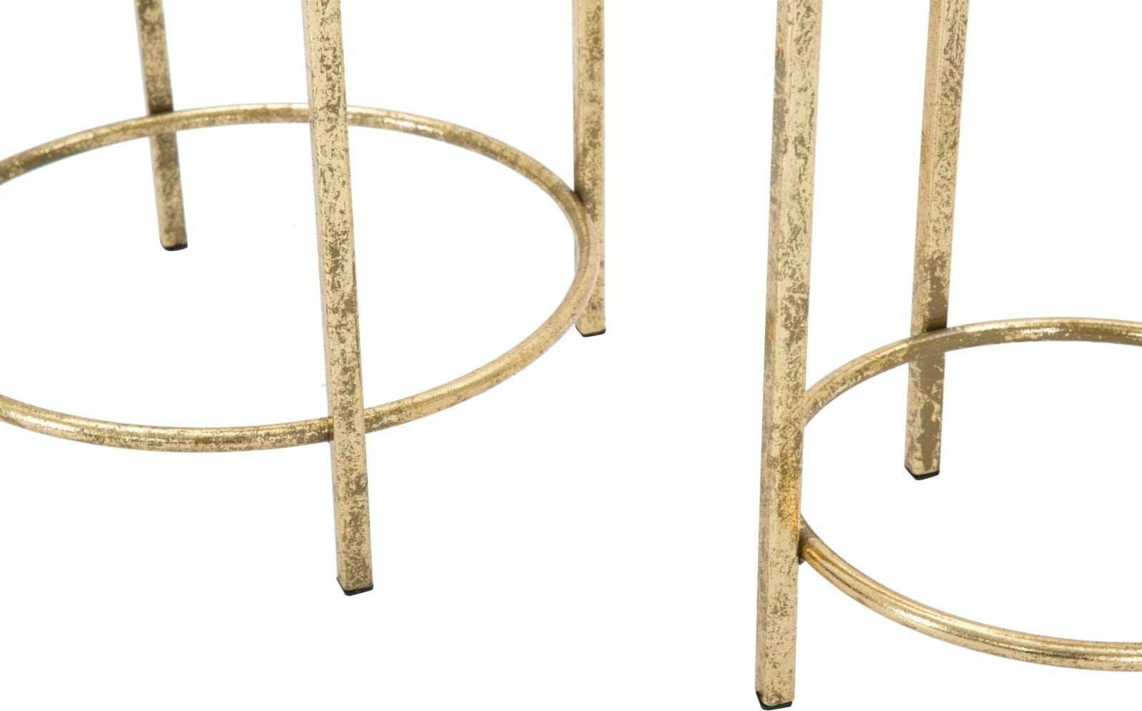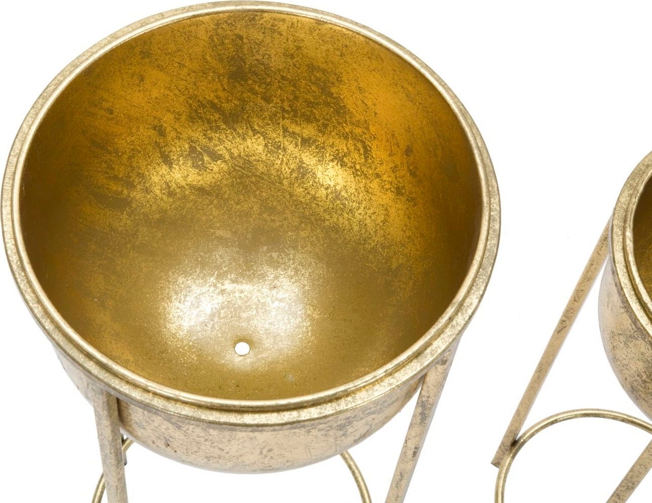 S tema dvema elegantnima cvetličnima loncema dodajte svojemu domu razkošen in glamurozen pridih! Par je v celoti izdelana iz kovine zlate barve s prefinjenim starinskim sijajem. Polkrožna lonca stojita na visokih, vitkih stojalih dveh različnih višin in zagotavljata popoln oder za vaše rastline.