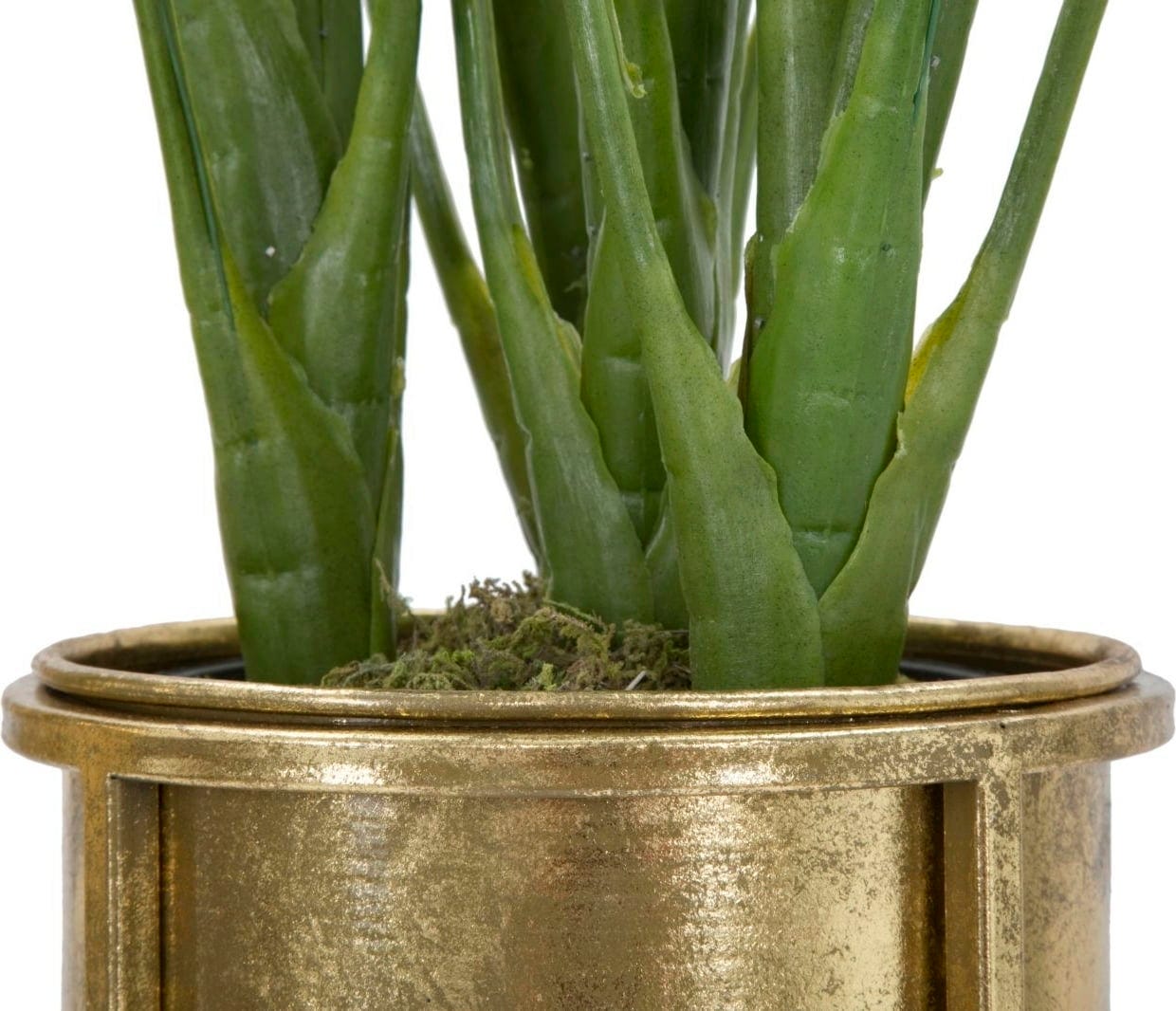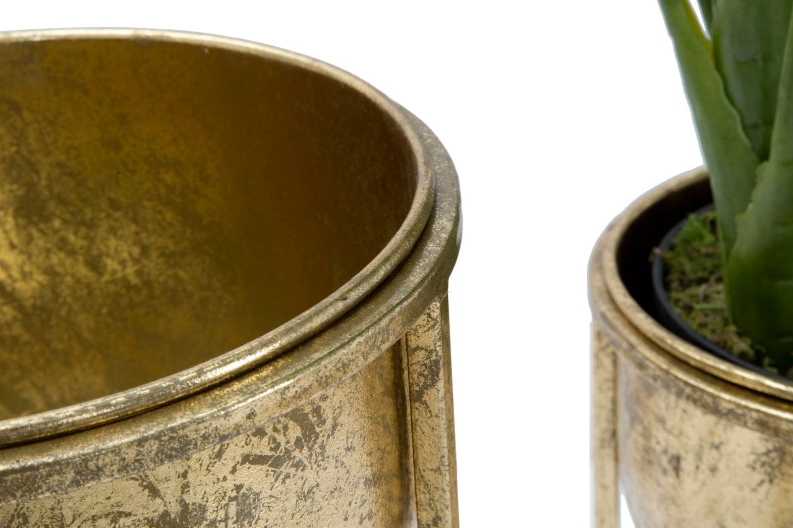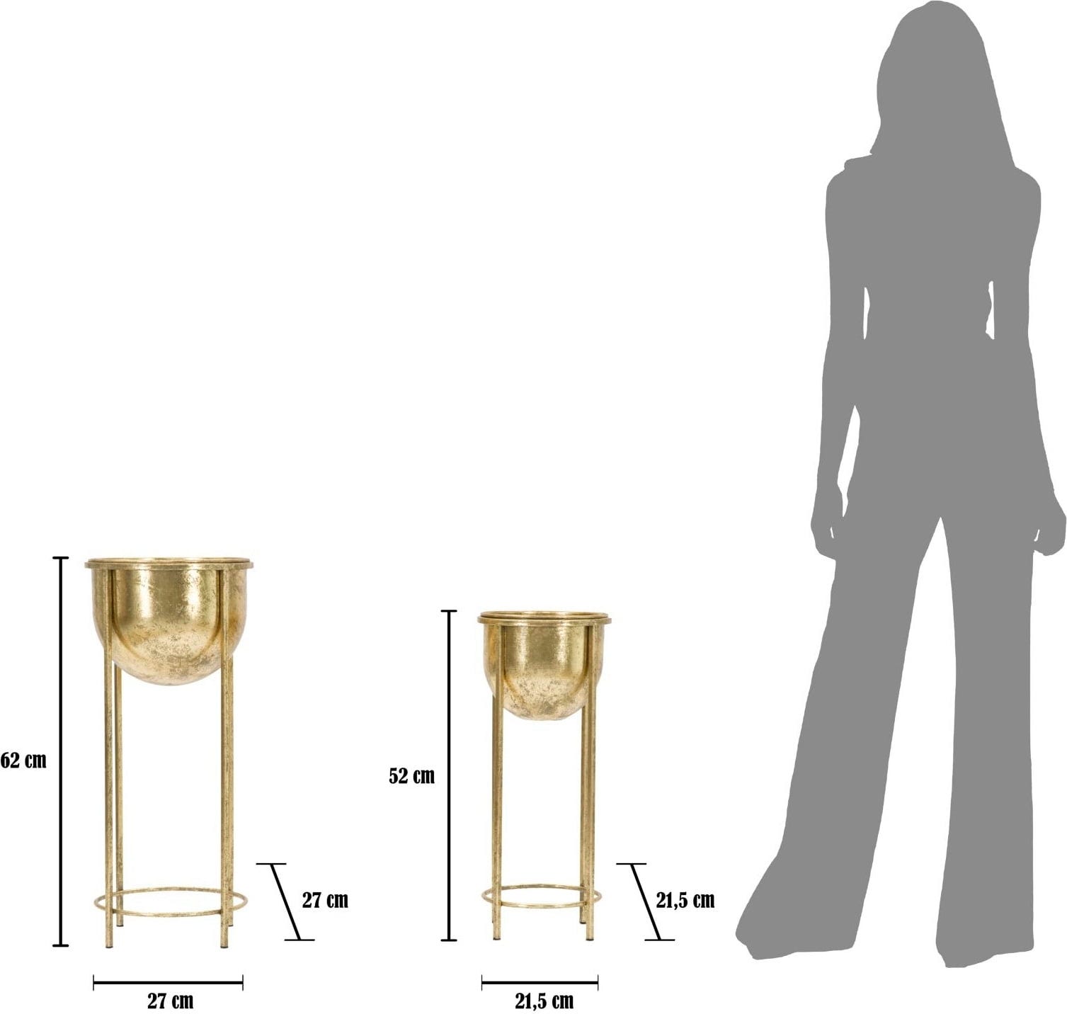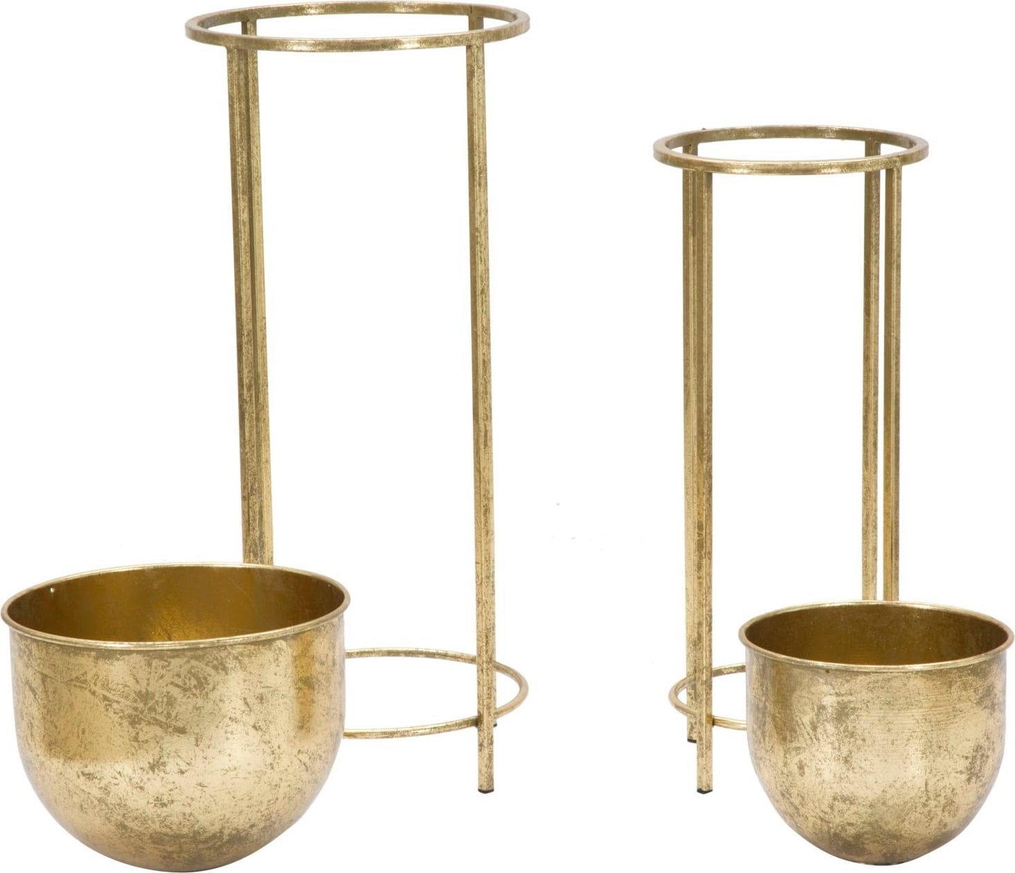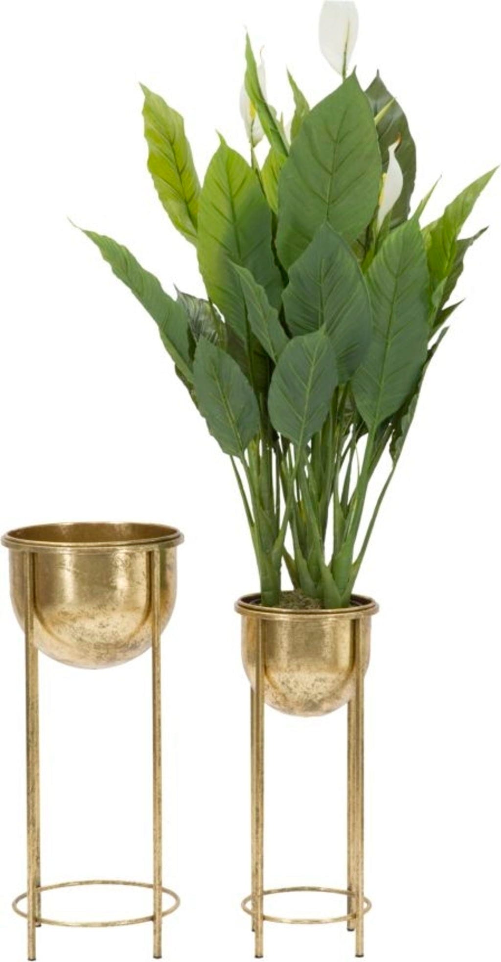 S tema dvema elegantnima cvetličnima loncema dodajte svojemu domu razkošen in glamurozen pridih! Par je v celoti izdelana iz kovine zlate barve s prefinjenim starinskim sijajem. Polkrožna lonca stojita na visokih, vitkih stojalih dveh različnih višin in zagotavljata popoln oder za vaše rastline.