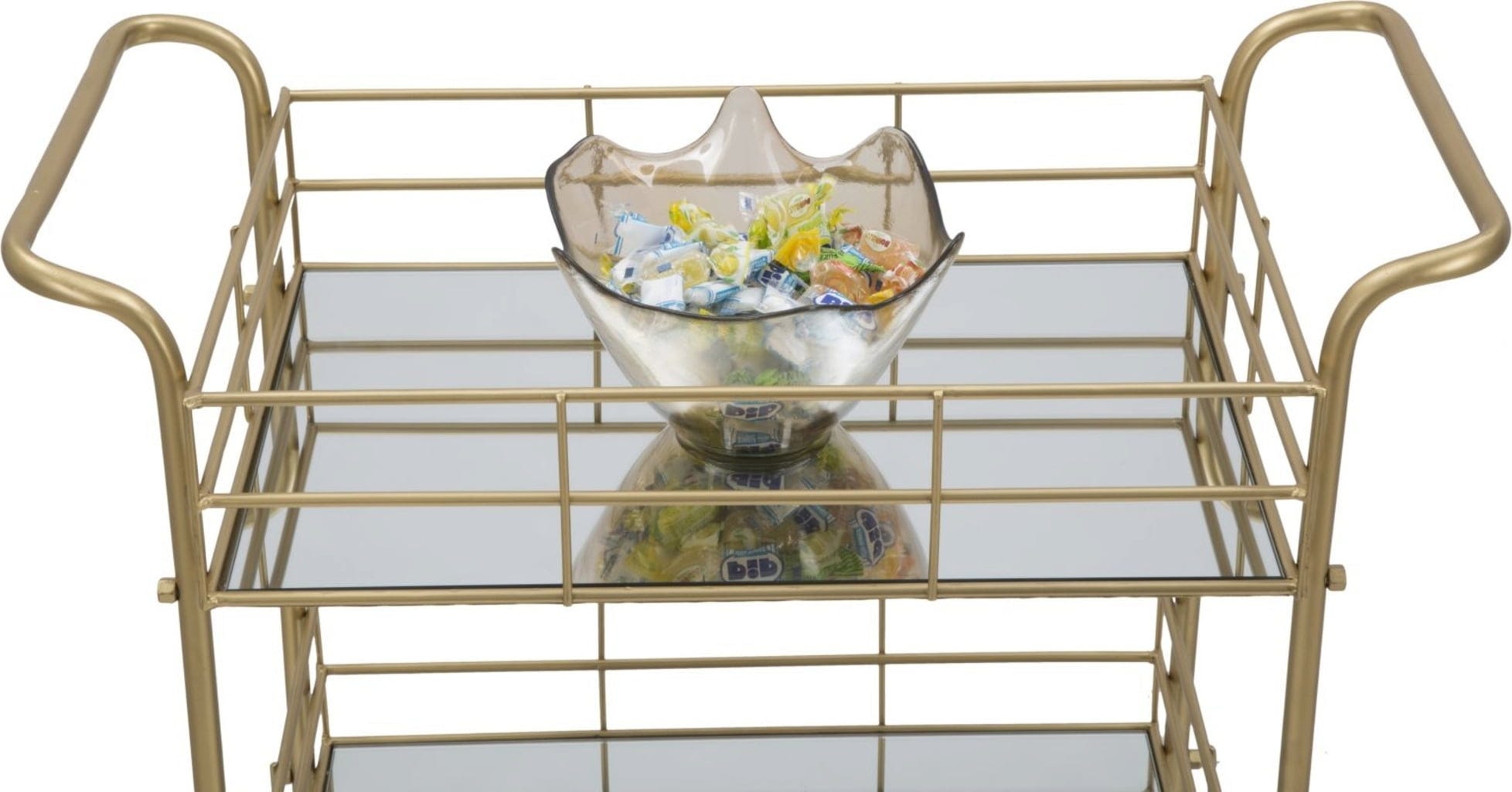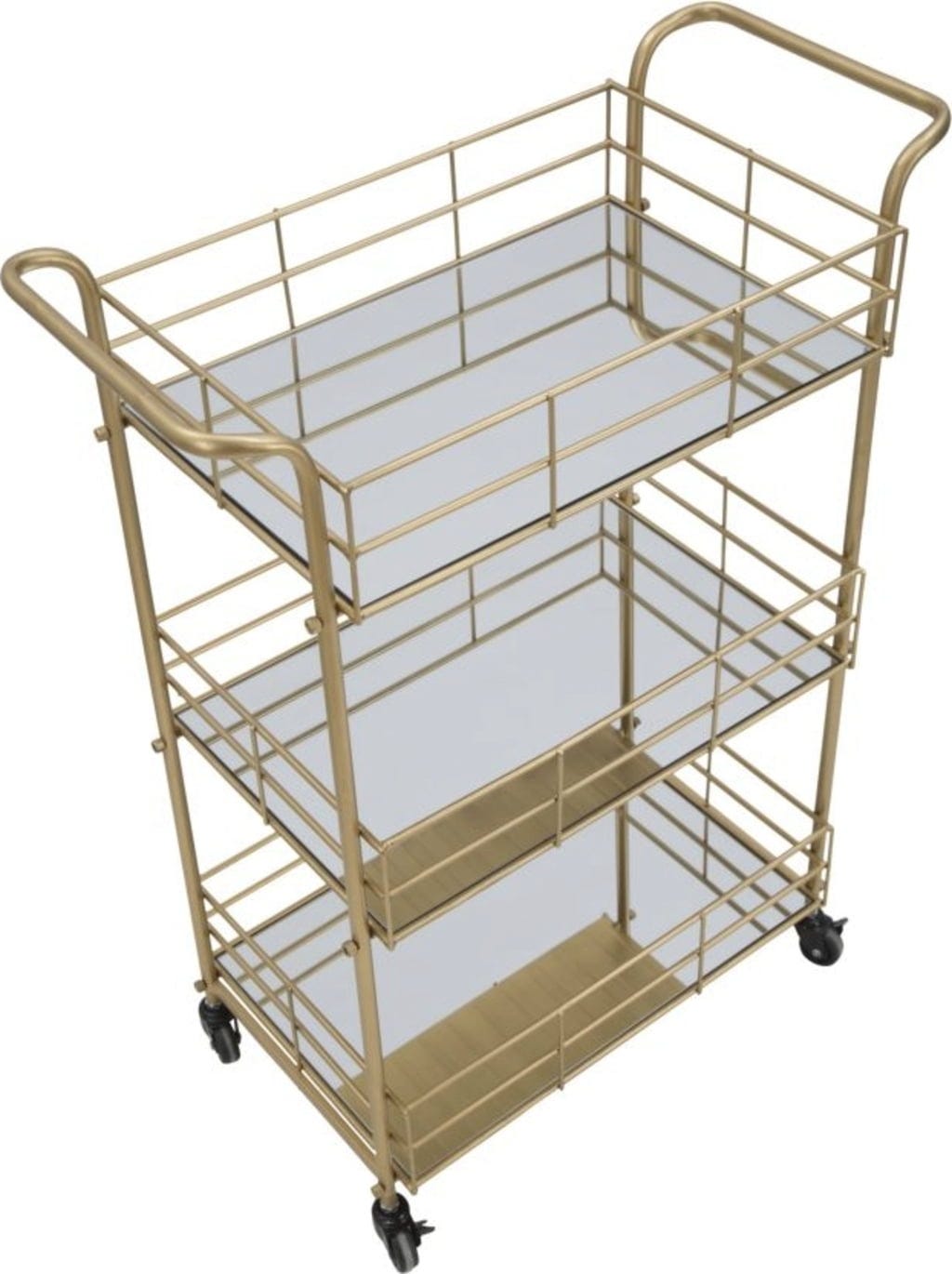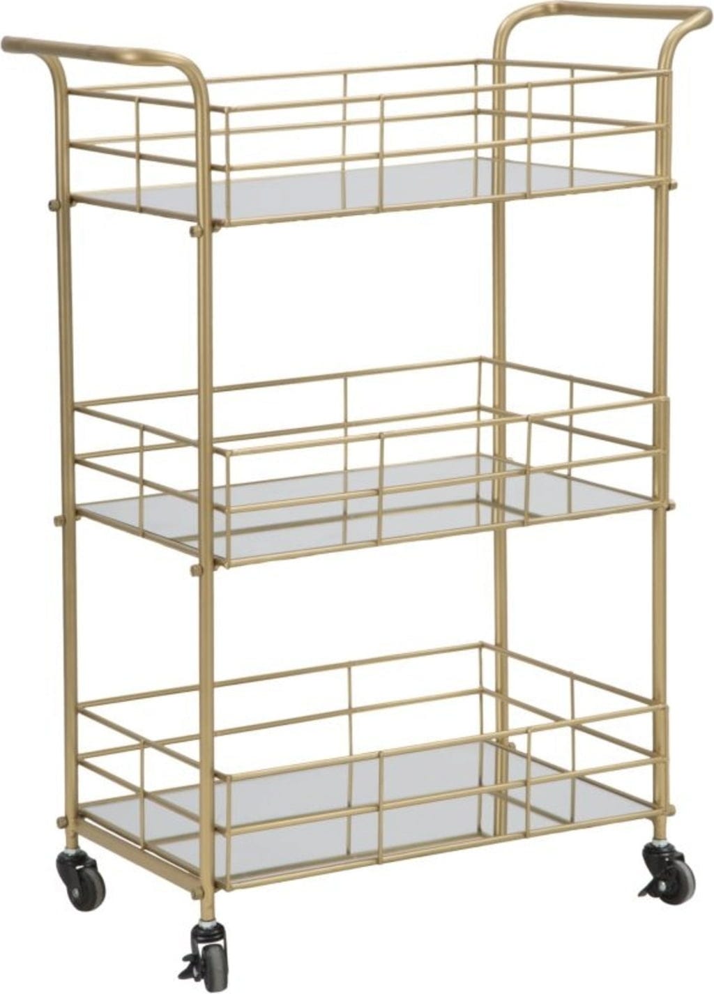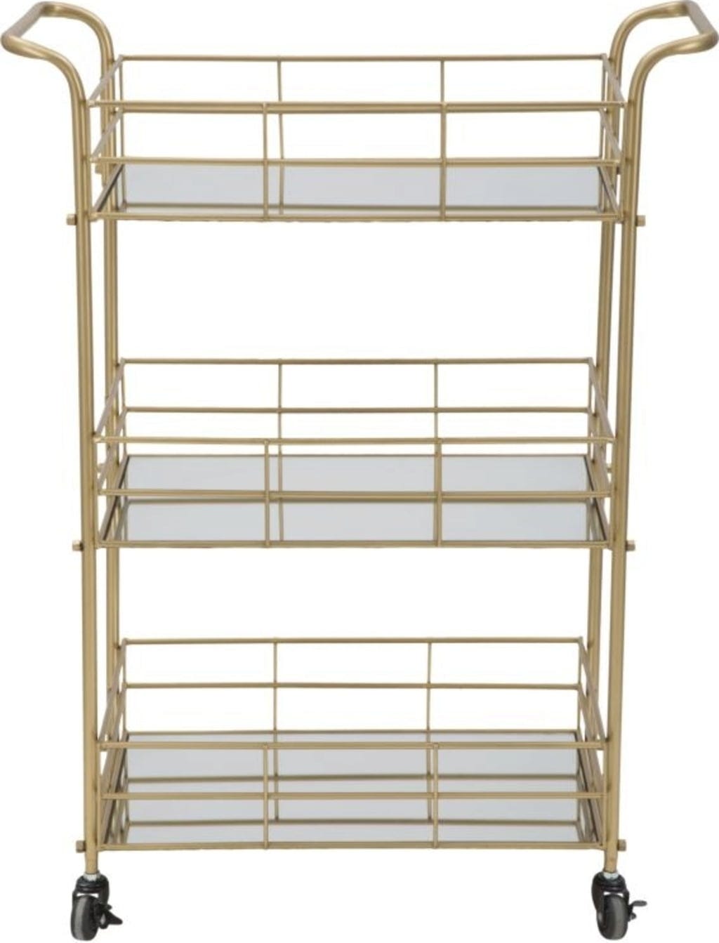 Ta pravokotni kovinski voziček je nepogrešljiv pripomoček za vsak glamurozen dom! Okvir zlate barve daje pohištvu prefinjen videz in je v vsakem prostoru prava paša za oči. Voziček je opremljen s tremi zrcalnimi policami in predstavlja razkošno prizorišče za kozarce, pijačo ali okrasne predmete.