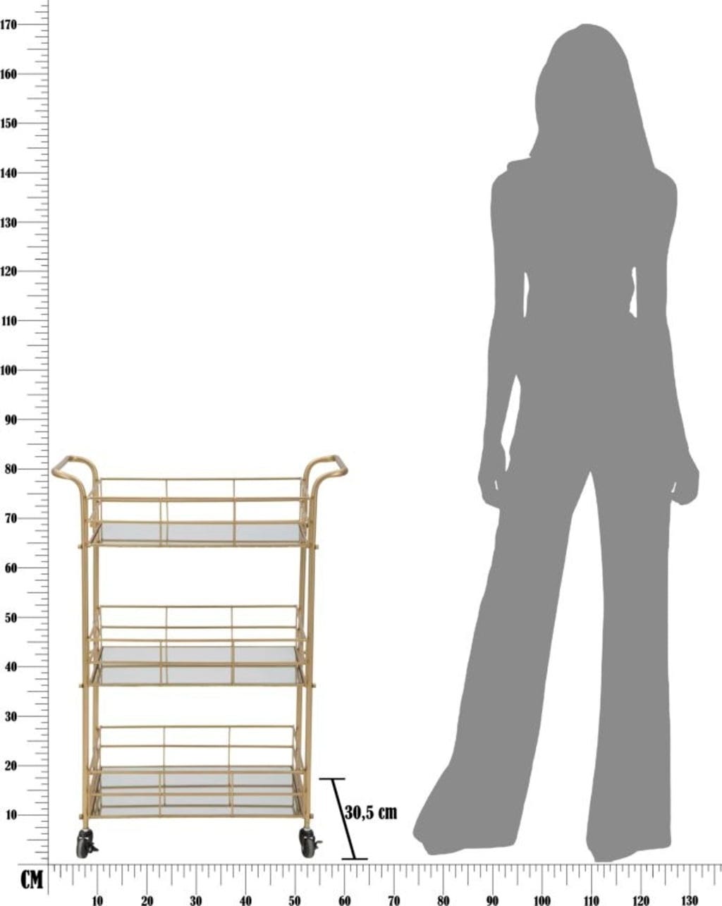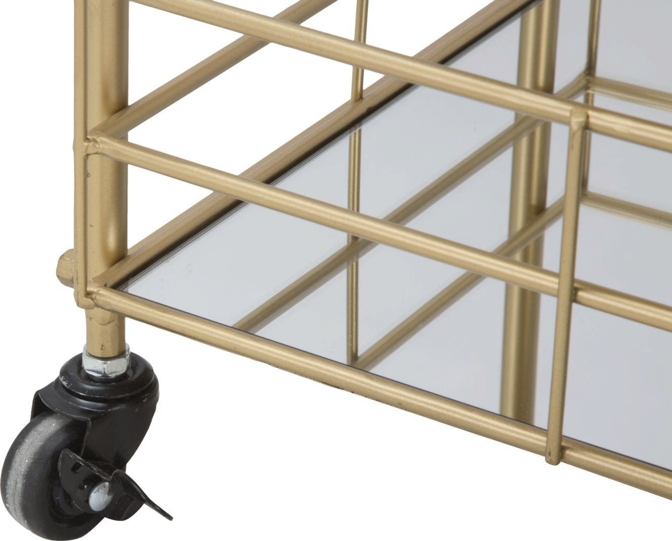 Zahvaljujoč praktičnim kolescem in integriranim ročajem na zgornji strani lahko servirni voziček brez težav premikate in prilagodljivo uporabljate. V svojo dnevno sobo ali jedilnico vnesite pridih zlata in funkcionalne elegance - servirni voziček pa je hkrati tudi prava popestritev za domači bar!