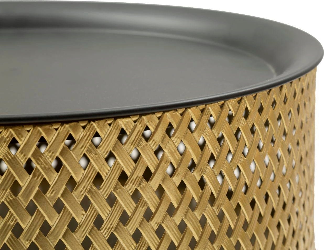 S to majhno okroglo stransko mizico dodate bivalnemu prostoru eleganten in praktičen pridih. Združuje sodoben dizajn s pametno večnamenskostjo. Ohišje odlikuje sijoča kovina zlate barve z drobnim tkanim vzorcem, ki ji daje razkošno in elegantno teksturo.