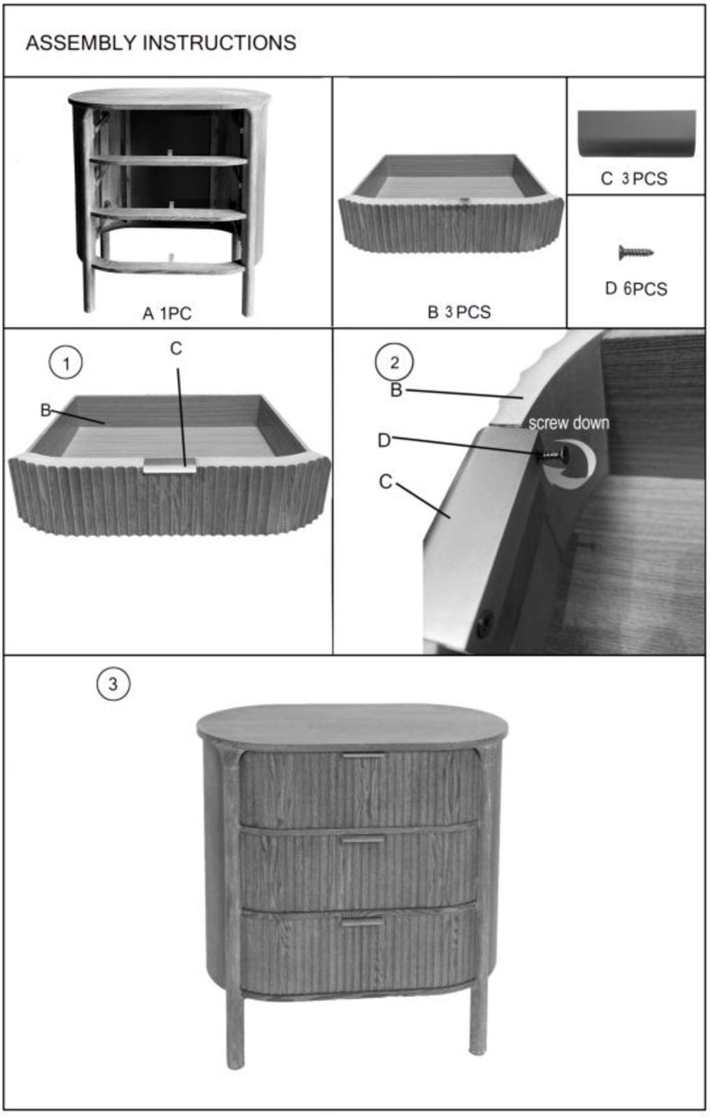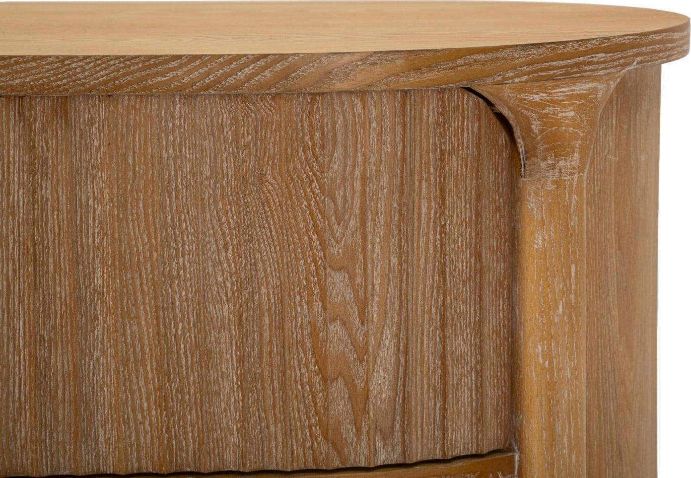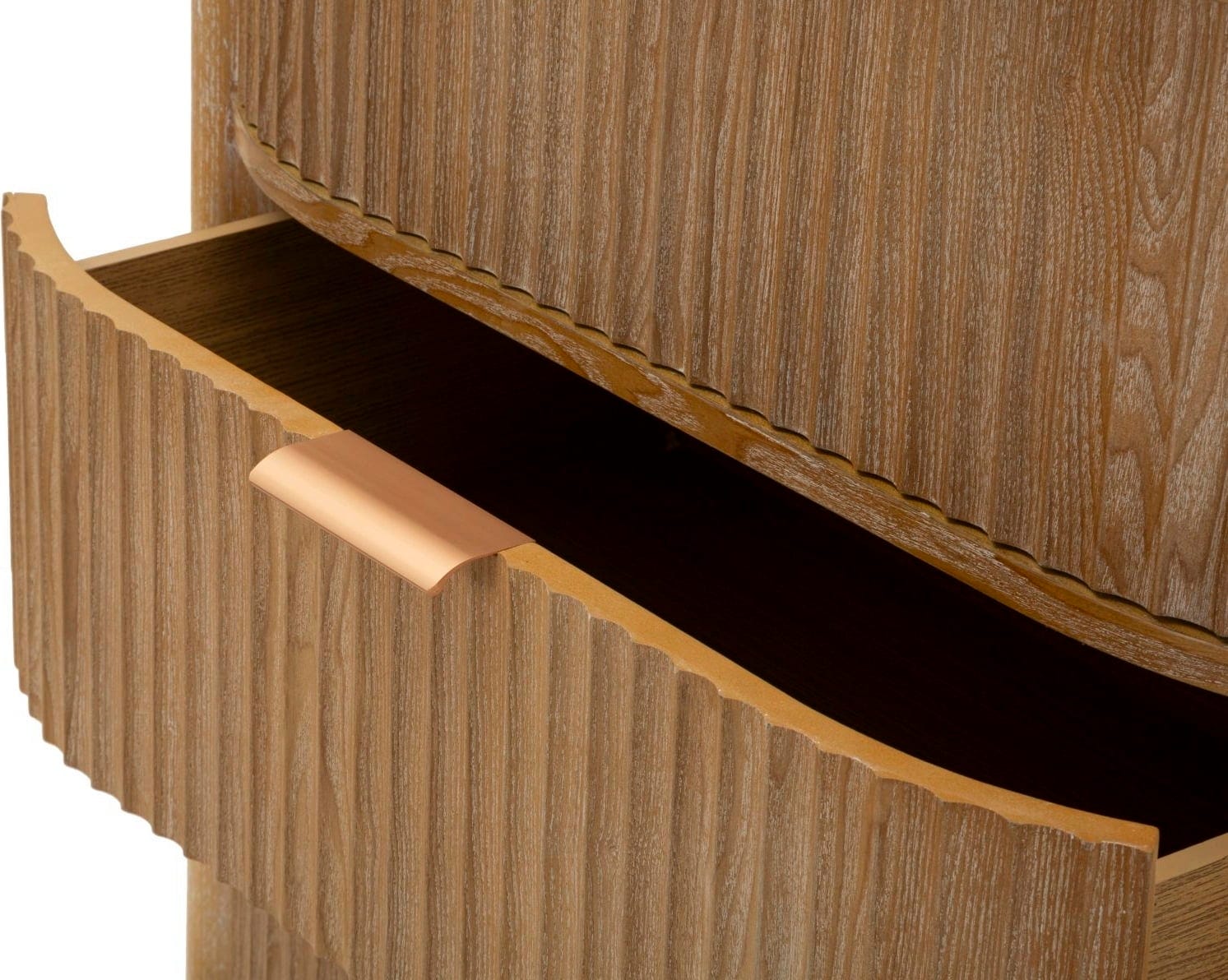 Sprednje strani imajo subtilno navpično strukturo, ki daje komodi prefinjeno teksturo. Zahvaljujoč trem velikim predalom ponuja ogromno prostora za shranjevanje, idealnega za vnos reda in miru v vašo spalnico ali dnevno sobo. Eleganten videz dopolnjujejo diskretni ročaji bakrene barve. Komoda je popoln kos pohištva za harmonično združitev funkcionalnosti in estetske umirjenosti.