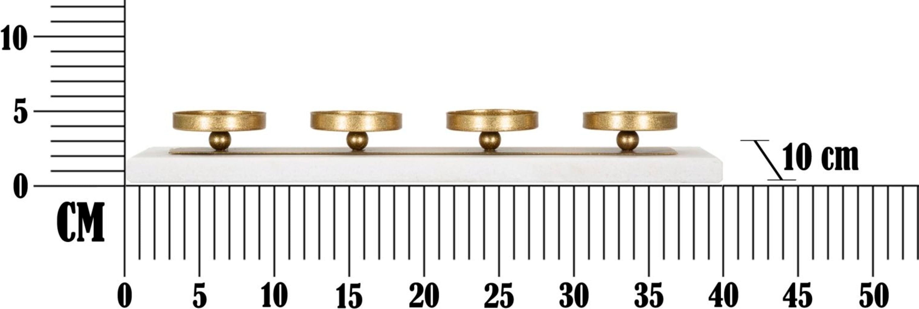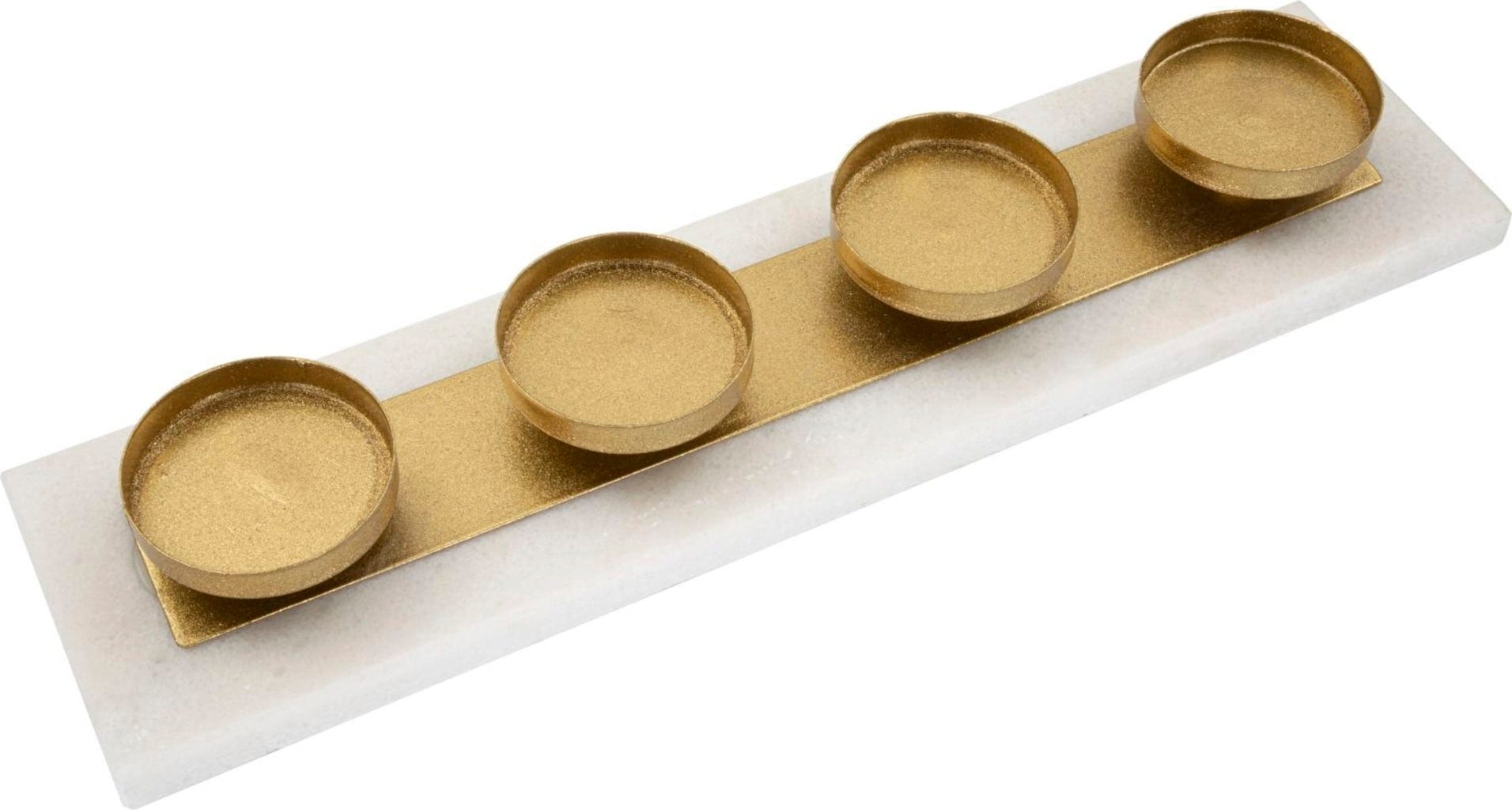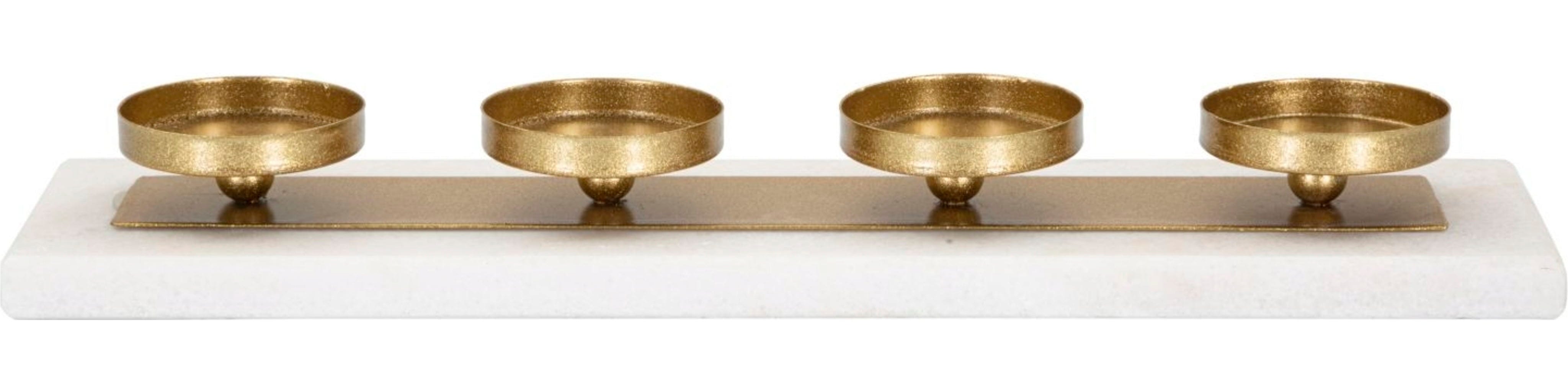 S svečnikom Marble znamke Mauro Ferretti lahko v svoj dom vnesete dizajnerski predmet, ki navdušuje s svojo preprosto popolnostjo in visokokakovostno izbiro materialov. Štirji minimalistični posodice za sveče v elegantni zlati barvi so nameščene na trdnem pravokotnem podstavku iz bleščečega belega marmorja, tako da vaše sveče dobesedno lebdijo nad gladino.