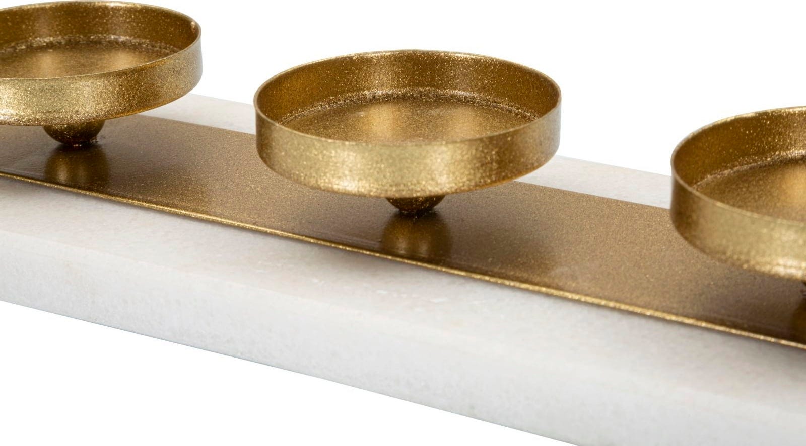 S svečnikom Marble znamke Mauro Ferretti lahko v svoj dom vnesete dizajnerski predmet, ki navdušuje s svojo preprosto popolnostjo in visokokakovostno izbiro materialov. Štirji minimalistični posodice za sveče v elegantni zlati barvi so nameščene na trdnem pravokotnem podstavku iz bleščečega belega marmorja, tako da vaše sveče dobesedno lebdijo nad gladino.