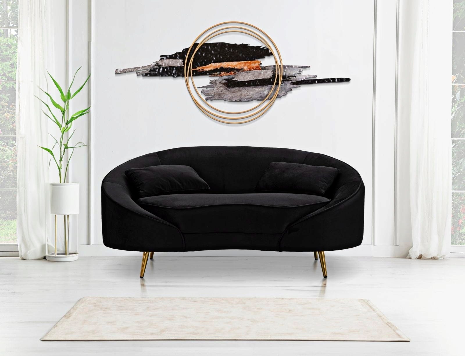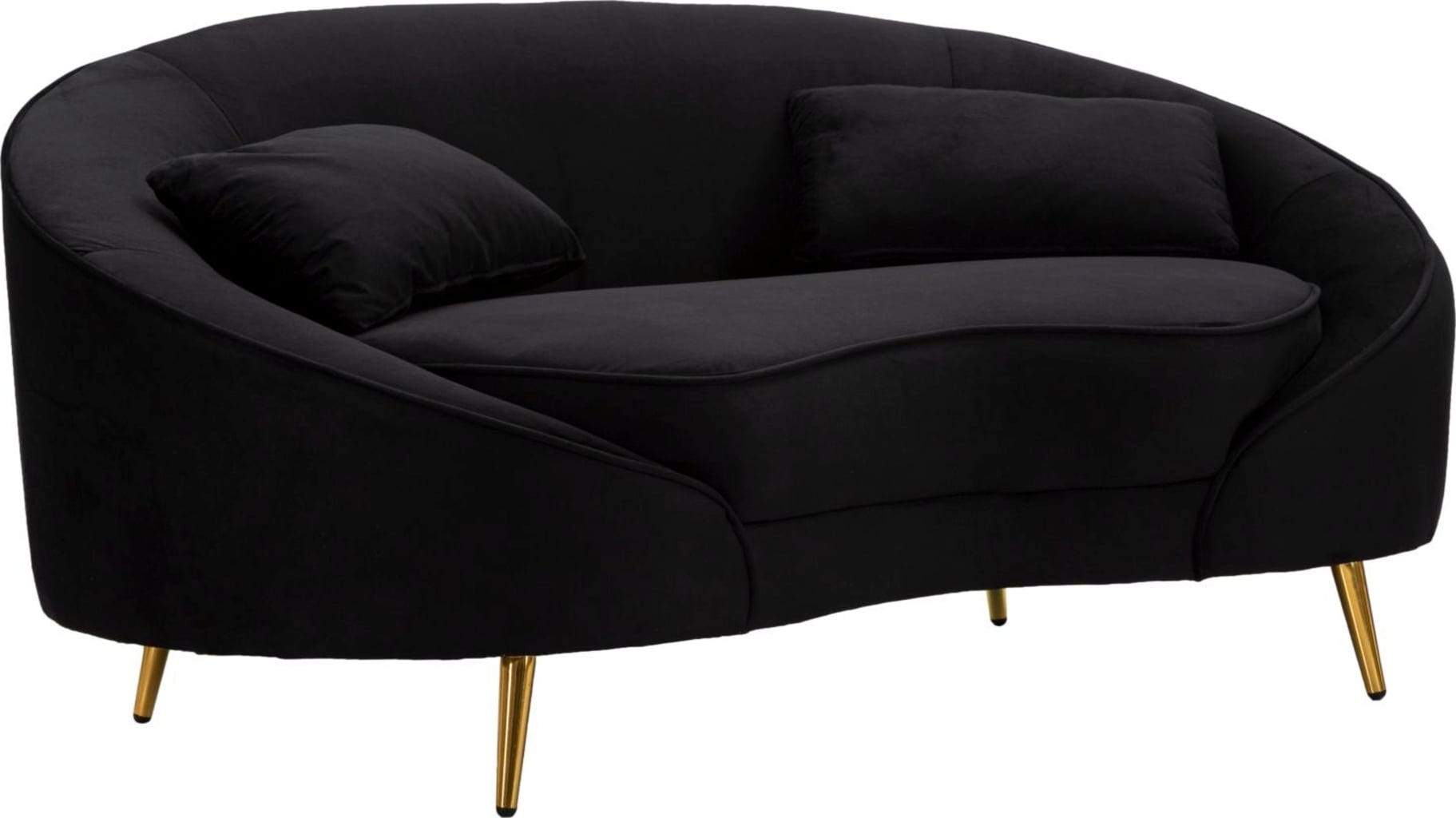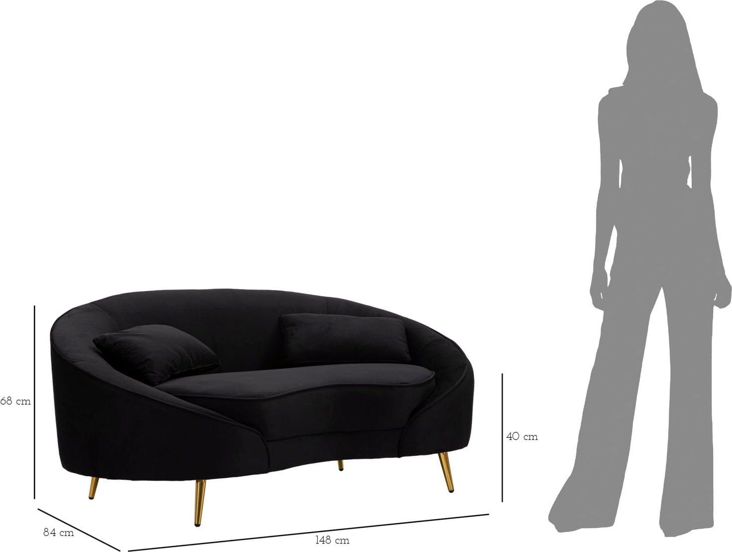 S tem elegantnim dvosedom vnesite v svojo dnevno sobo pridih elegance, svežine in razkošnega udobja! Luksuzna, mehka oblazinjena tkanina v elegantni črni barvi in mehke, vabljive linije ukrivljene, asimetrične oblike ustvarjajo pravo paša za oči.