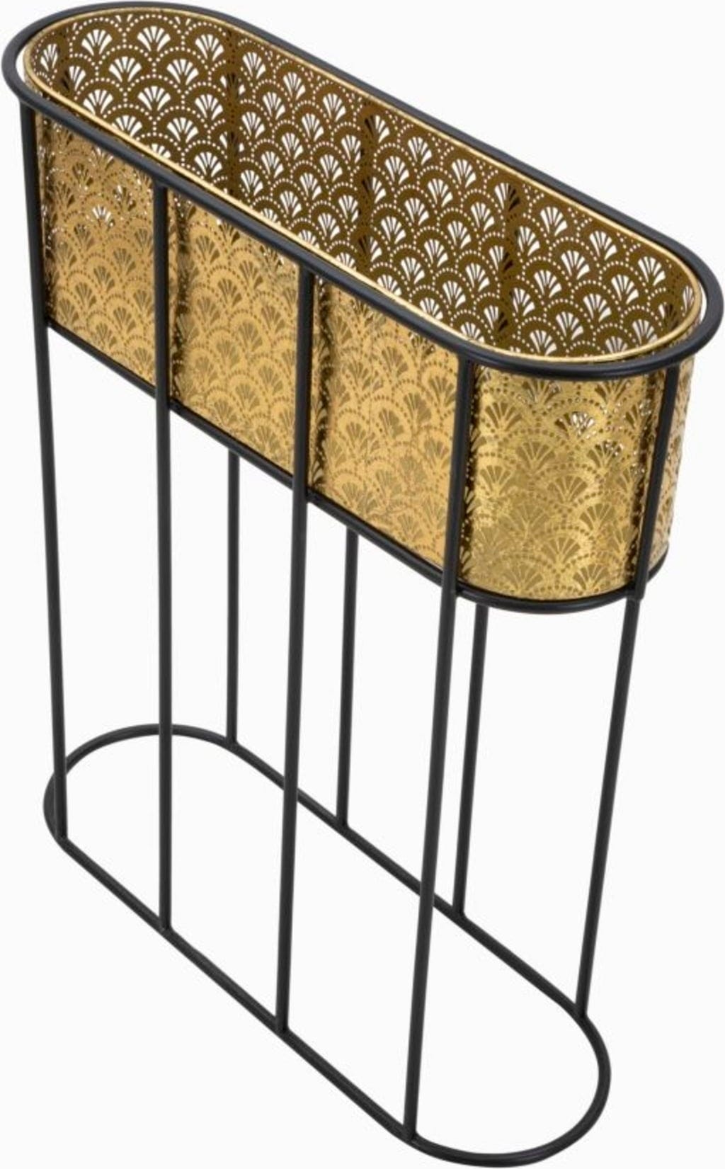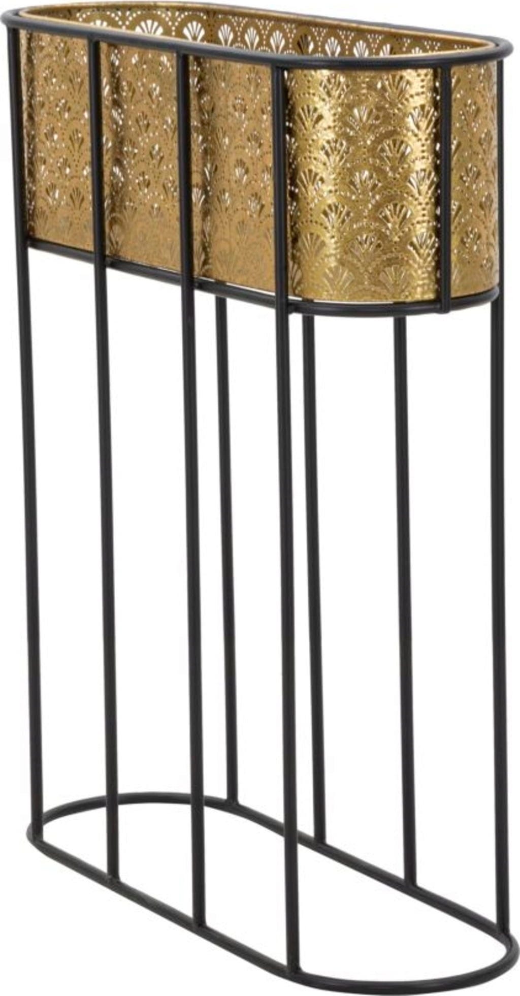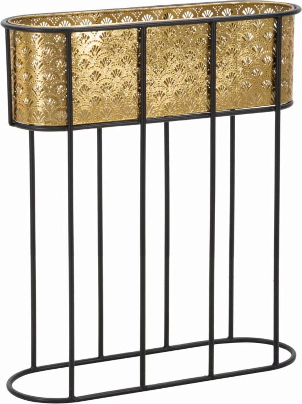 S tem elegantnim stojalom za cvetlične lonce dajte prostoru harmoničen in razkošen pridih! Ovalni vstavek je izdelan iz fino izdelane kovine zlate barve in ima nežen cvetlični vzorec, ki ustvarja čudovite učinke, ko skozenj pada svetloba.