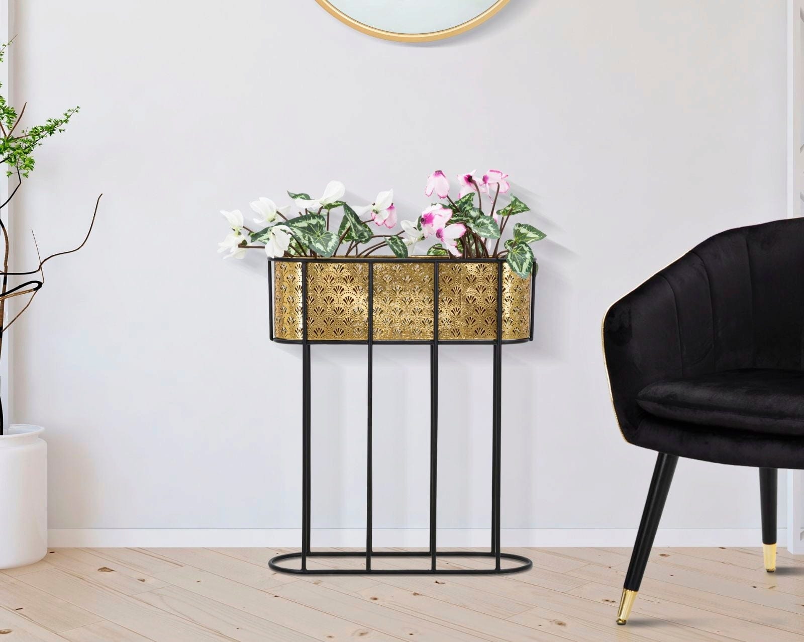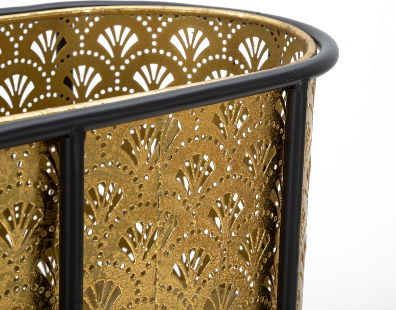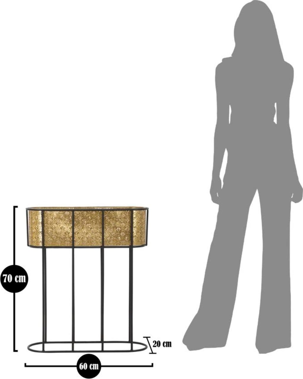 S tem elegantnim stojalom za cvetlične lonce dajte prostoru harmoničen in razkošen pridih! Ovalni vstavek je izdelan iz fino izdelane kovine zlate barve in ima nežen cvetlični vzorec, ki ustvarja čudovite učinke, ko skozenj pada svetloba.