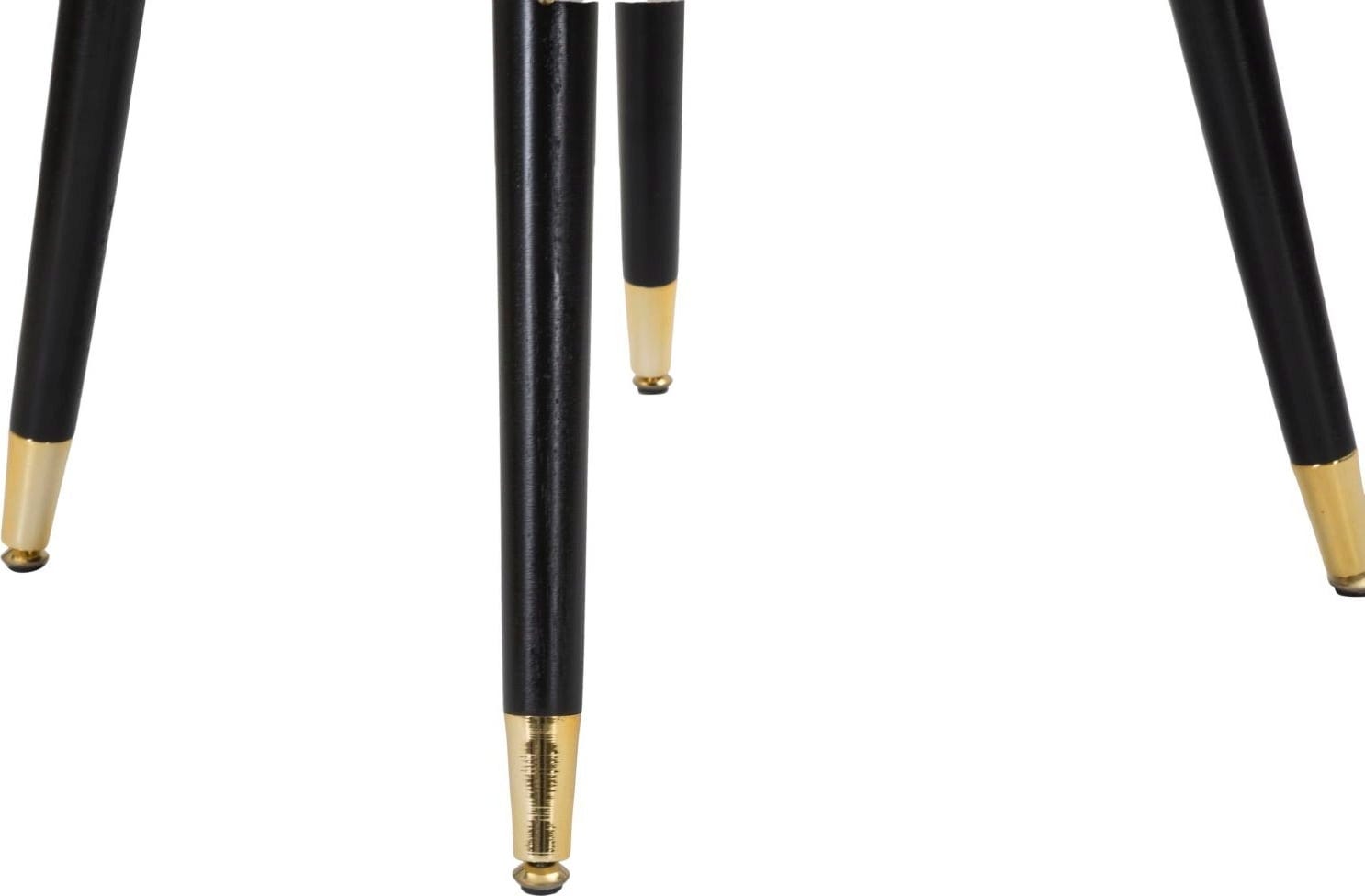 Fotelj stoji na trdnih, pod kotom nagnjenih črnih lesenih nogah, ki so okrašene s svetlečimi zlatimi detajli - brezčasna barvna kombinacija, ki izžareva čisto eleganco. Idealen je za bralni kotiček ali kot eleganten dodatek k kavču.