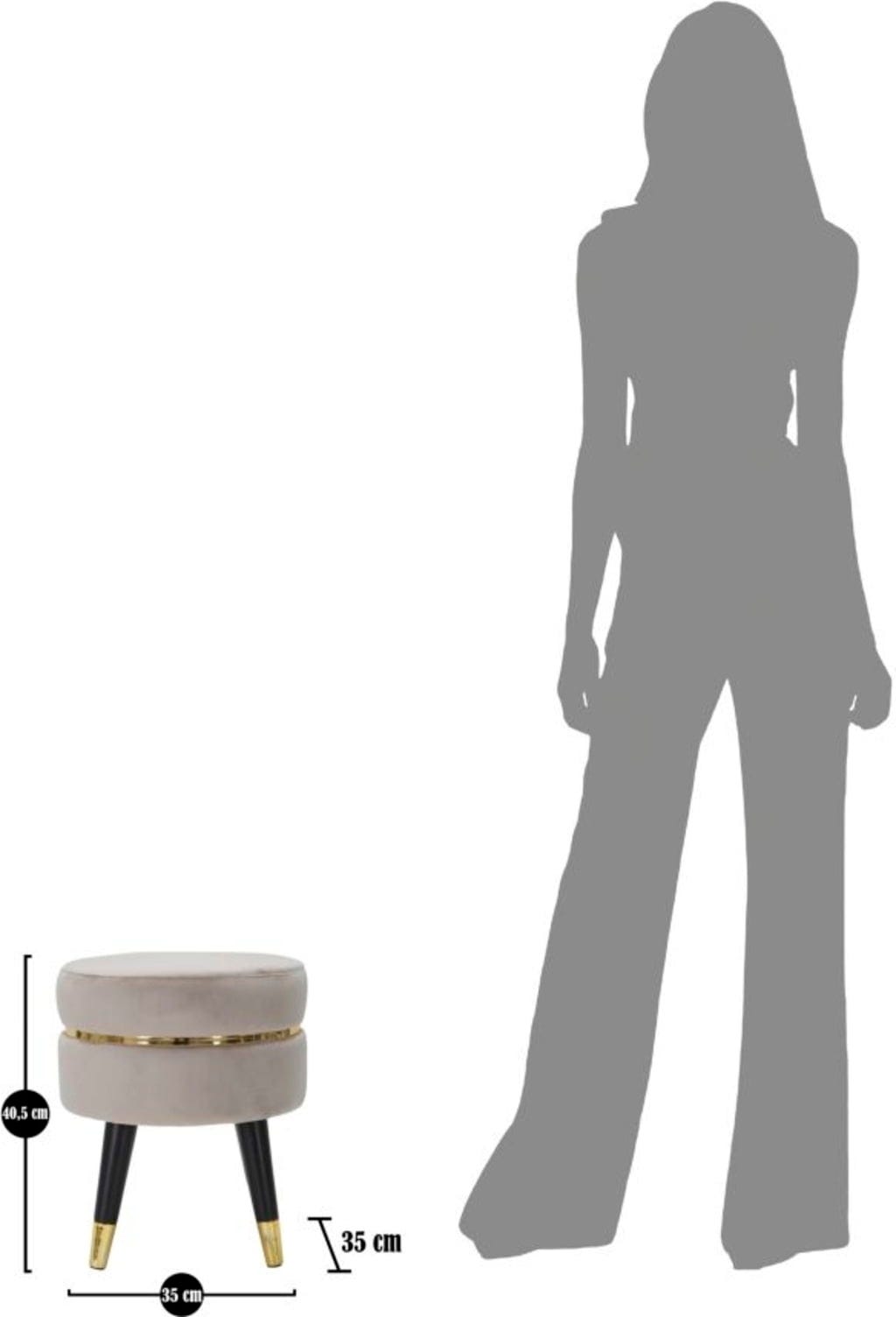 Stolček obdaja privlačen kovinski obroč v zlati barvi, ki je bleščeč poudarek. Stolček podpirajo poševne črne lesene noge. Idealen je kot stranski stolček v dnevni sobi ali kot eleganten sedež v spalnici!